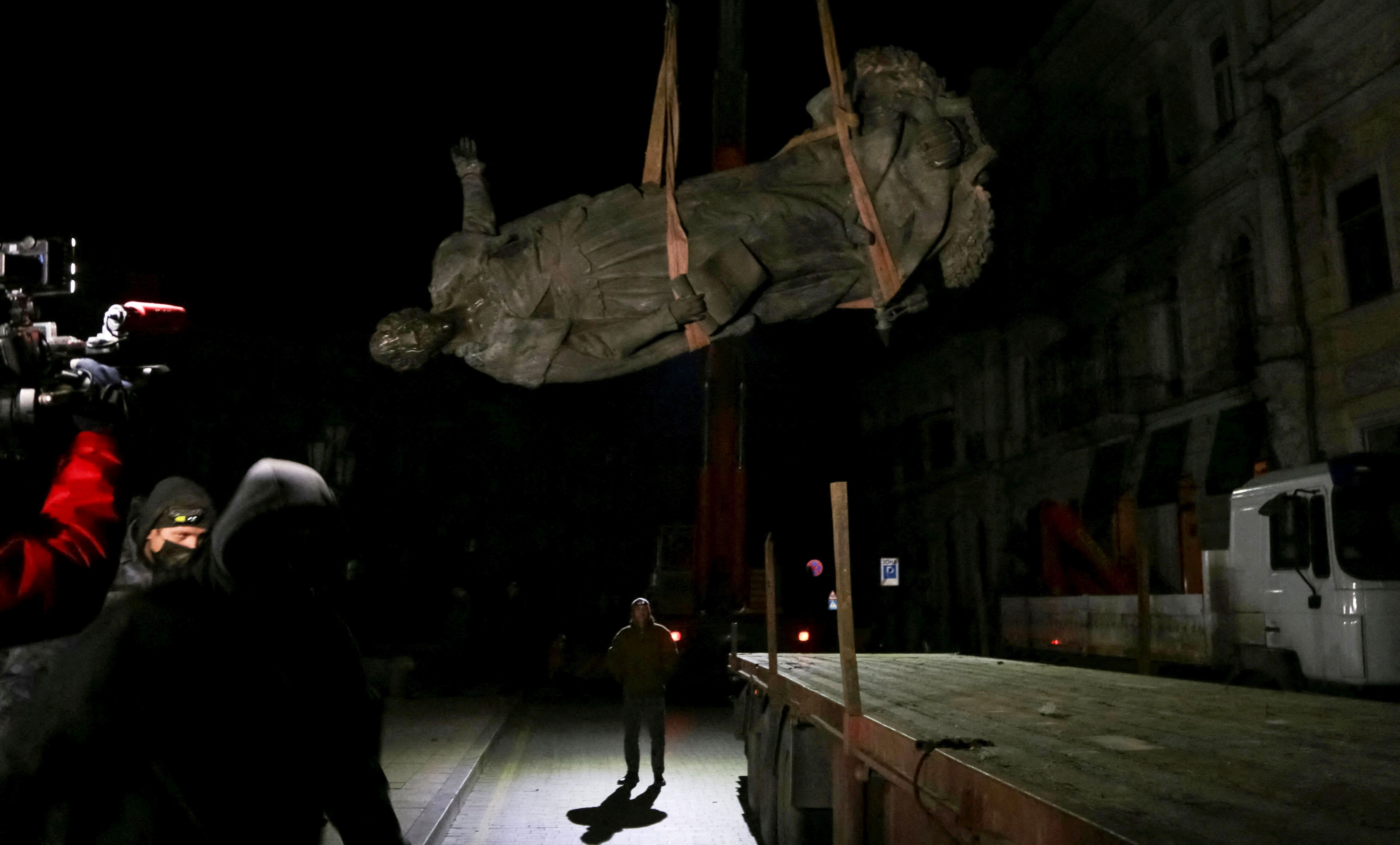 – Нет, она не видела, все было огорожено, нельзя было просто стоять и смотреть. Спецслужбы серьезно проверяли пропуска. У меня было разрешение, там было 30 журналистов, даже моего оператора не допустили, я сам с камерой стоял. Мне было очень интересно, что я почувствую, потому что лет до 18 я являлся частью этого “Общества 9 Мая”. Считал, что, если пойдет трактор, буду стоять перед памятником и защищать его. Поешь “Прощание славянки”, смотришь на бабушку и плачешь. Мне было интересно, удалось ли мне уйти от этого. Придя туда, видя, как падают фигуры композиции, женщина и солдаты, я не почувствовал ничего, с точки зрения истории или политики.