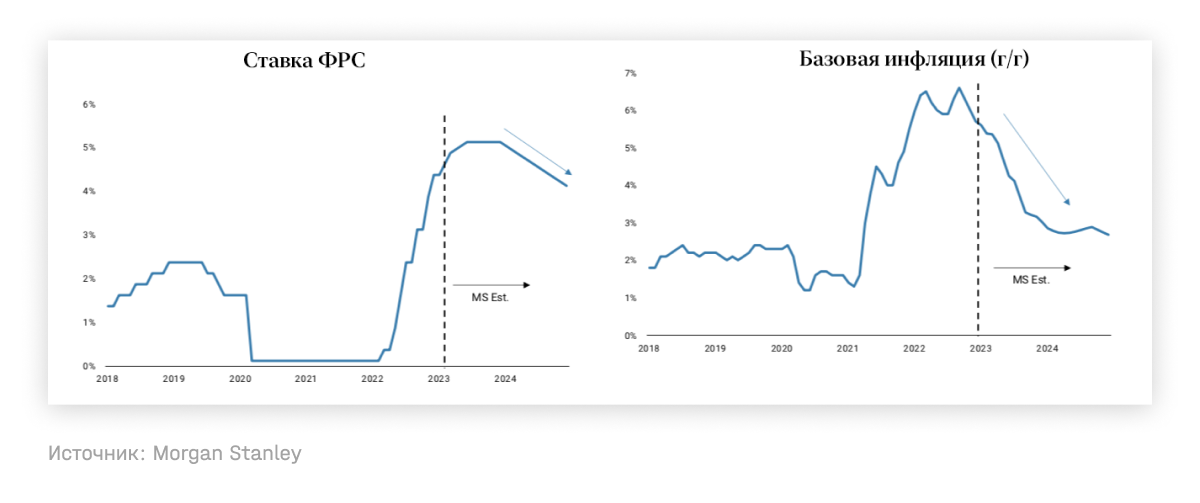 - Денежно-кредитная политика будет более «мягкой» по мере замедления темпов инфляции (это будет учитываться в ожиданиях рынков). В MS ждут сохранения только начавшегося тренда на замедление инфляции — к середине 2024 года базовая инфляция должна замедлиться с текущих 5,6% до 2,8%. В прогнозе MS не заложена инфляция, но если она случится, то ФРС придется быть еще более сговорчивой.