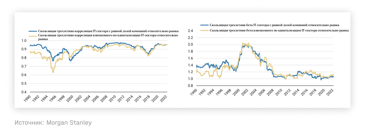 Исторически IT-сектор и рынок в целом движутся синхронно: они имеет сильную корреляцию, сейчас коэффициент составляет 0,95. При этом с 1990 года он в основном находился в диапазоне 0,8–1, что свидетельствует о высокой степени корреляции. Коэффициент бета (меры относительного риска) — с 2008 года колеблется в диапазоне 1–1,2. Это значит, что вложения в IT-сектор, который зачастую оценивался выше, были лишь немногим рискованнее рынка в целом.
