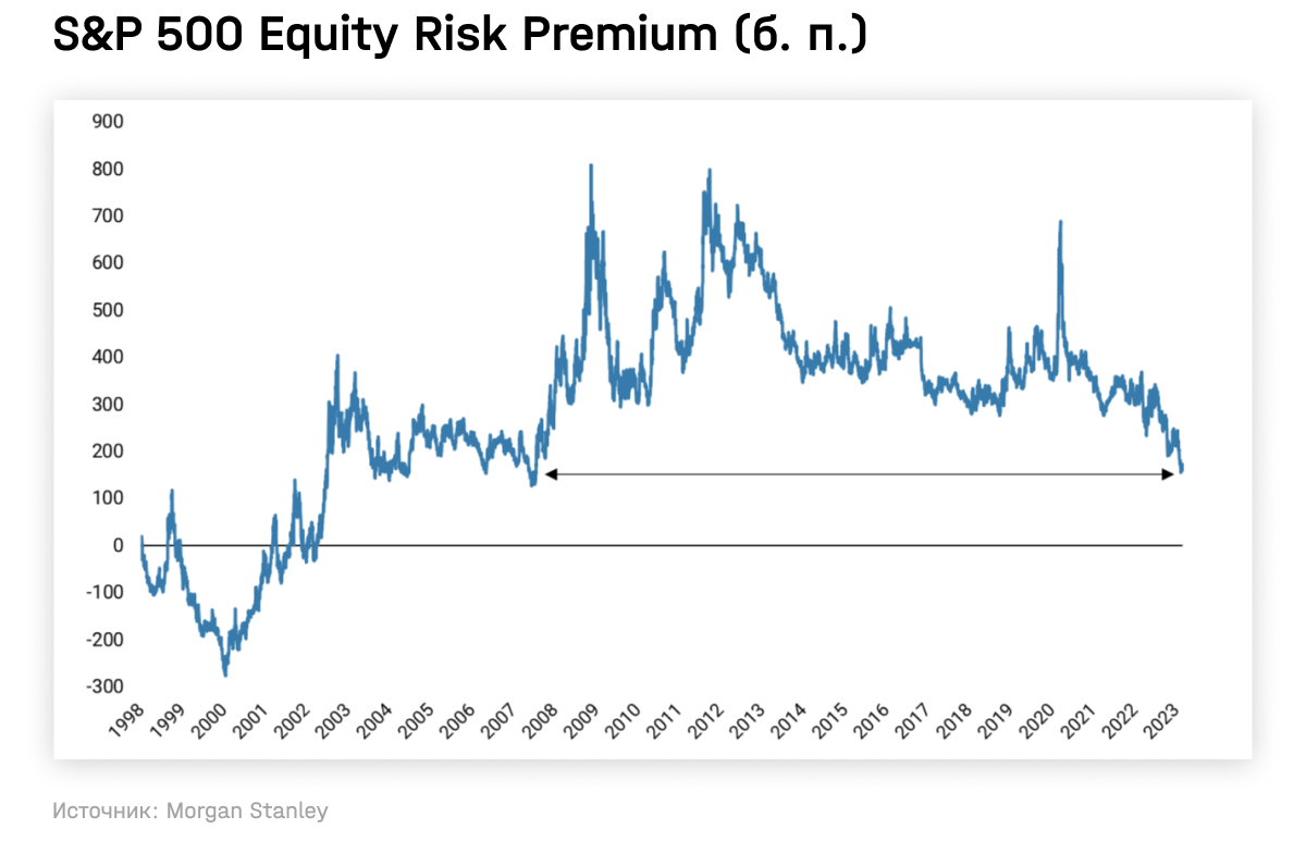 Текущий уровень (~160 б. п.) — один из самых низких с 2007 года, несмотря на неопределенную ситуацию с прибылями, монетарной политикой и макроэкономической ситуацией. Это даже не сильно отличается от премий за вложения в облигации инвестиционного уровня, которые обладают меньшим риском по сравнению с акциями. Оценки рынков все еще оторваны от справедливых значений, но такие факторы, как, например, ужесточение риторики ФРС, происходившее в последние недели, должно способствовать росту ERP, отмечают в MS.