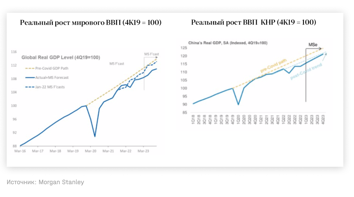 - Восстановление глобального экономического роста, в том числе в экономиках, которые до конца еще не оправились от локдаунов, и прежде всего Китая. Аналитики MS отмечают в качестве одного из драйверов роста в КНР более ориентированную на рост политику властей. В последние месяцы власти послали несколько позитивных сигналов бизнесу. При этом рост в КНР и мире все еще отстает от доковидного тренда.