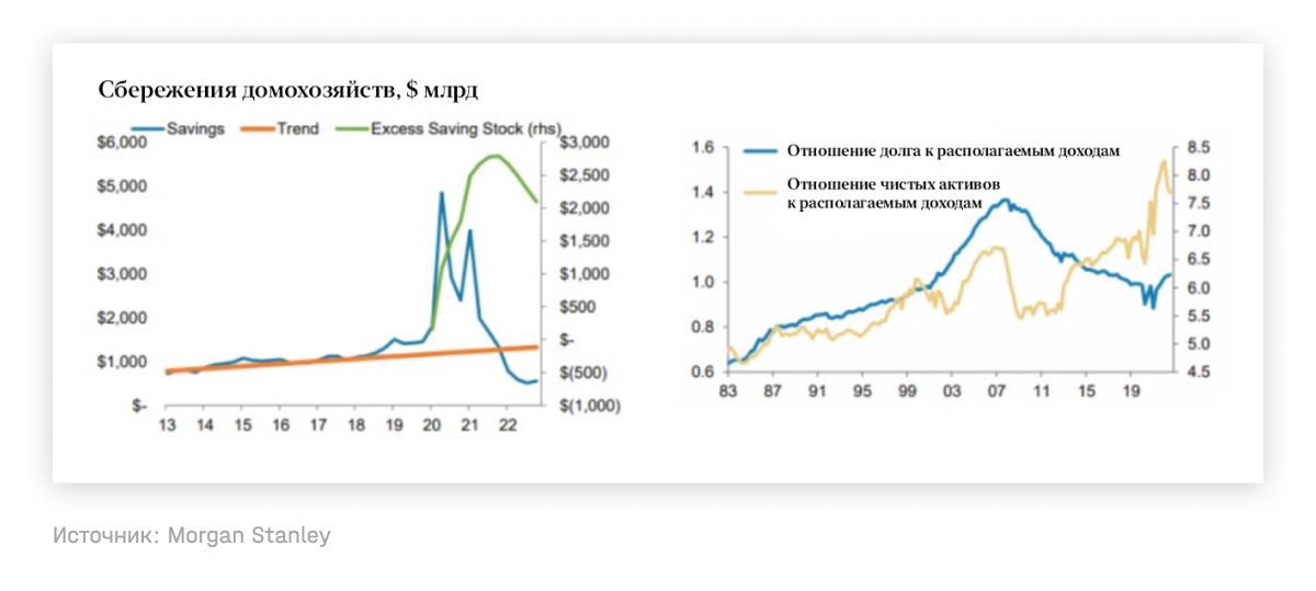 - Потребители останутся в хорошей форме: домохозяйства располагают большими, чем обычно на текущей стадии экономического цикла, запасами денежных средств благодаря стимулирующим выплатам и сокращению расходов из-за пандемии. Хотя сейчас эти запасы сокращаются, отношение чистых активов домохозяйств к располагаемому доходу остается повышенным по историческим меркам, а отношение долга к располагаемым доходам — низким.