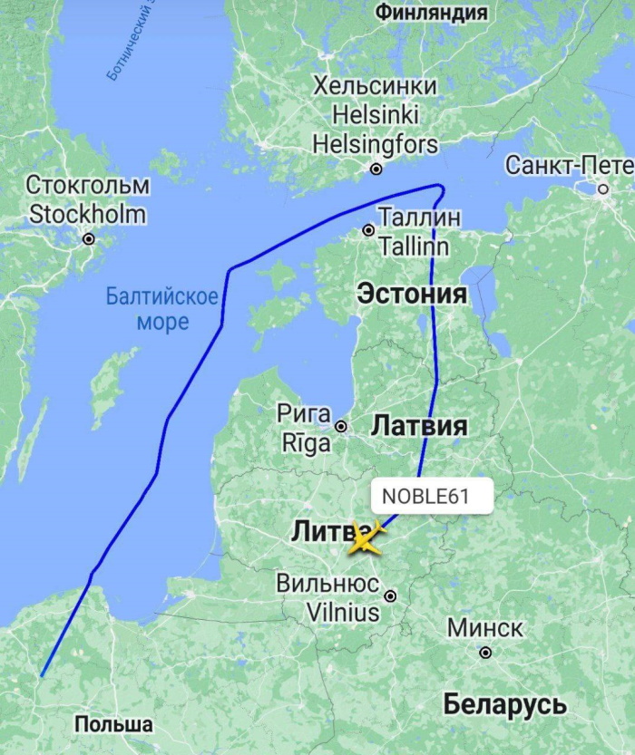 Самолет вылетел из Польши, пролетел над Литвой, Латвией и Эстонией, а затем развернулся в районе острова Гогланд в Финском заливе — в 200 километрах от Санкт-Петербурга. После этого он направился в сторону Великобритании, пишет «РБК».