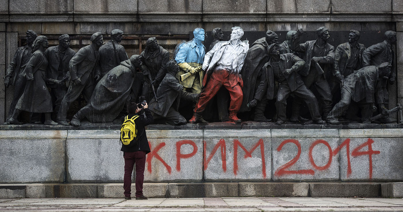 Мужчина фотографирует фигуры памятника времен социализма, раскрашенные в цвета украинского и польского флагов. Внизу надпись: "Крым 2014", также на раскрашенном памятнике была надпись "Катынь 5.03.1940". София, 5 марта 2014 года