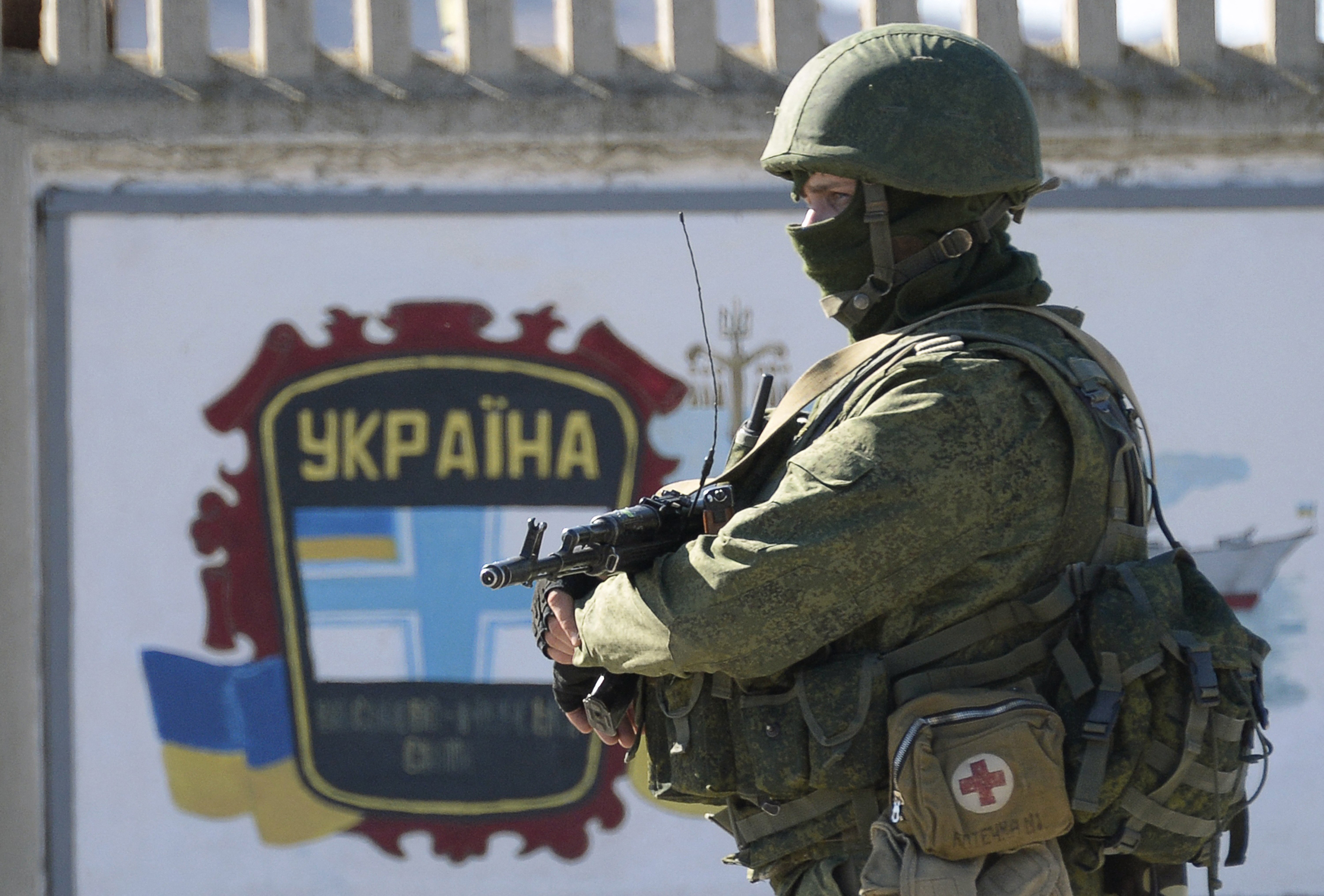 Российский военный рядом с украинской военно-морской базой в Крыму. Симферополь, 3 марта 2014 года