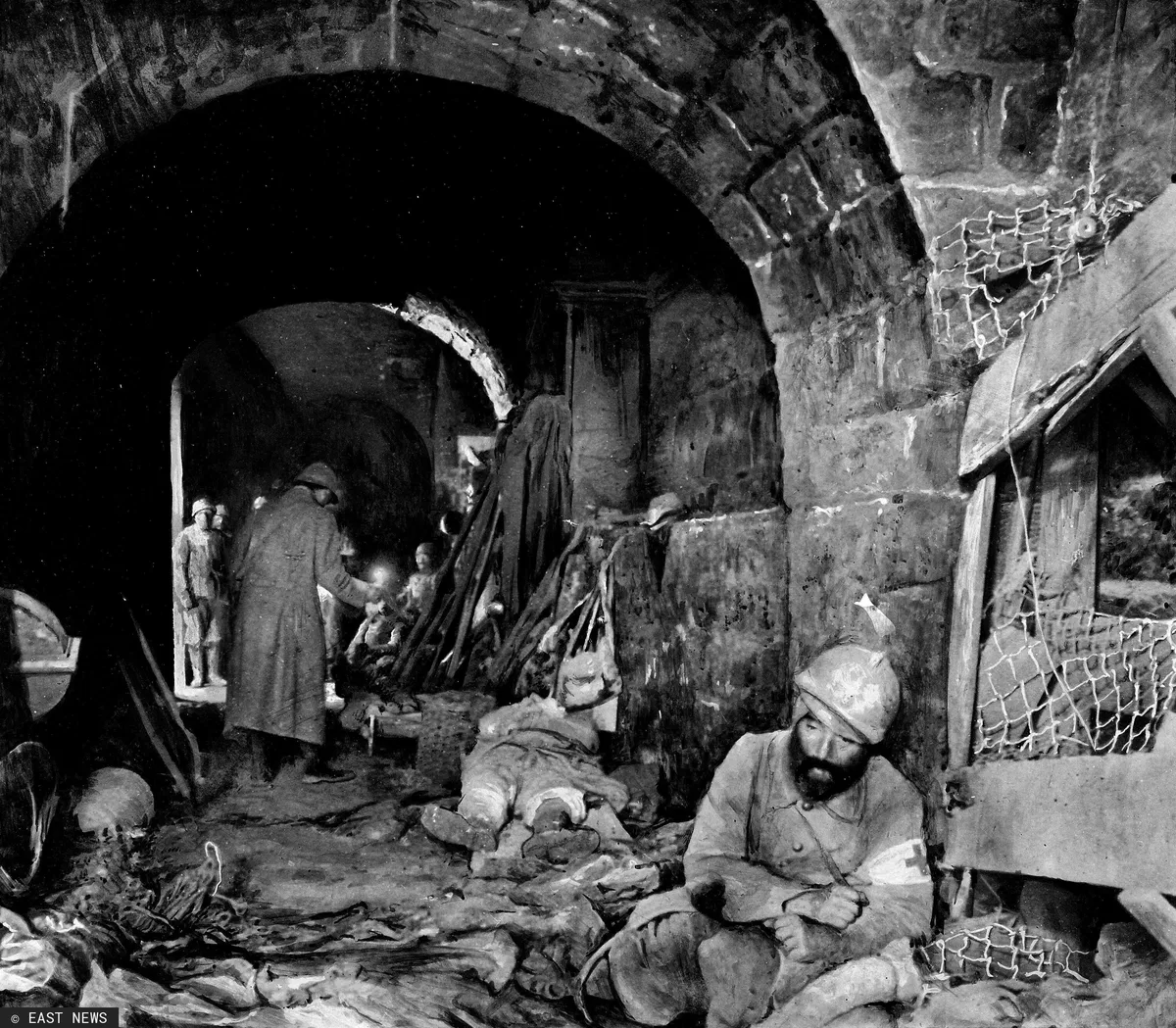 Автомобиль останавливается. Эта небольшая группа холмов — форт Vaux. Нас ведет французский солдат, у него карбидная лампа в руке. Другой солдат курит ядреный табак, и чувствуется солдатская атмосфера, одинаковая во всем мире: запах кожи, пота и сена, запах еды, табака и испарений человеческих тел. Теперь несколько ступенек вниз.