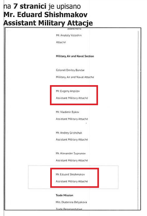 В феврале 2017 года спецпрокурор Черногории Миливое Катнич рассказал журналистам, что Шишмаков (в Черногории он действовал под фамилией Широков) ранее был помощником российского военного атташе в Варшаве и был выслан. В интернете есть служебная записка черногорской полиции о Шишмакове (ссылка, .pdf) со скриншотом списка сотрудников на сайте посольства РФ в Польше в то время. В этом списке рядом с Шишмаковым и с такой же должностью – дипломат Евгений Анпилов. В польской газете он также упоминался как помощник военного атташе. Сейчас, как следует из информации на сайте МИД Сербии, Анпилов занимает эту должность в посольстве России в Белграде.