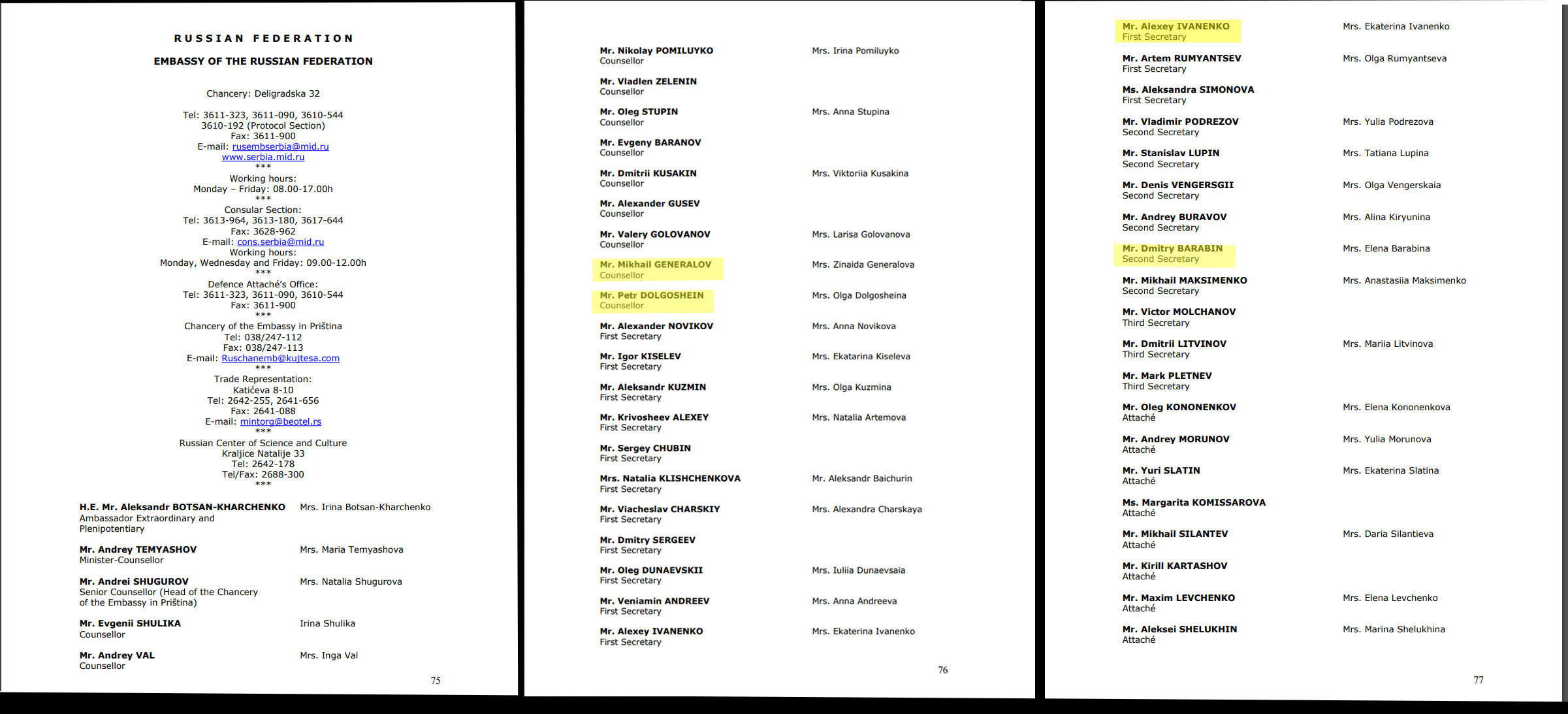 Владимир Подрезов, бывший в 2014 году третьим секретарем посольства в Черногории, тоже пошел на повышение и сейчас является вторым секретарем в Белграде. Наконец, Михаил Максименко, еще один второй секретарь российского посольства в Сербии, в 2017 году, незадолго до массовой высылки российских дипломатов из-за дела Скрипалей, был третьим секретарем в посольстве в Лондоне.