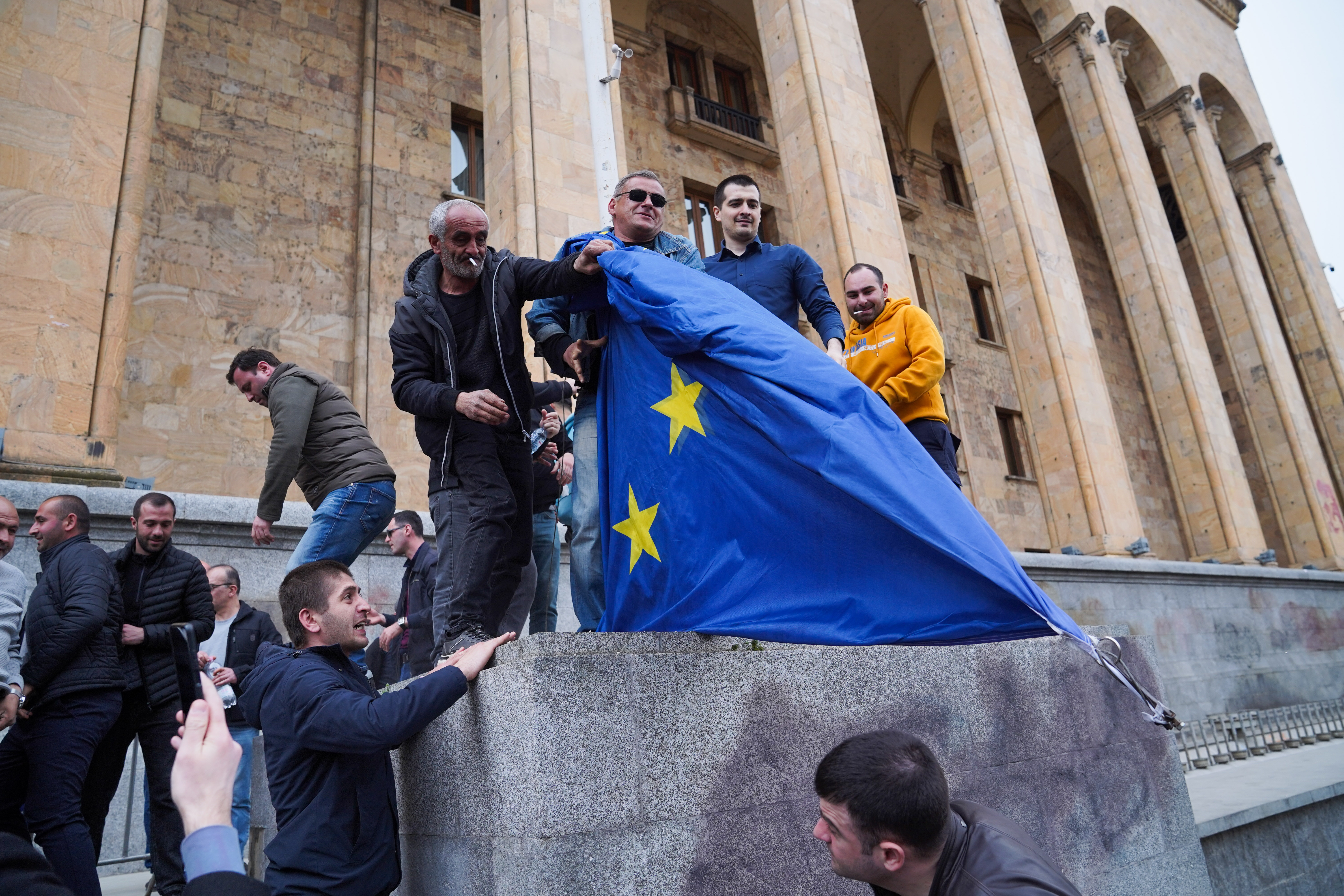 Сторонники закона об "иноагентах" сорвали флаг ЕС у парламента Грузии