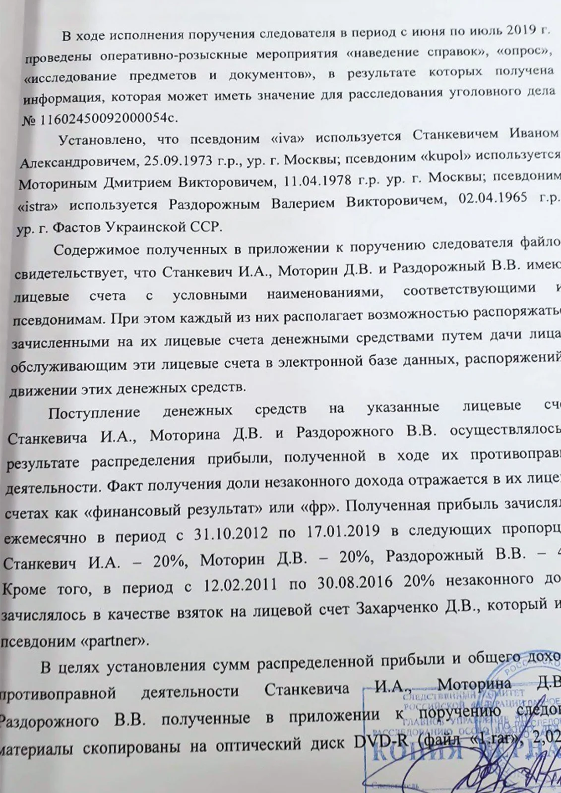 И из этого документа однозначно следует, что полковник Захарченко не получал взяток от банкиров — он был равноправным компаньоном банкстеров. И получал долю в 20% от дохода теневого бизнеса.