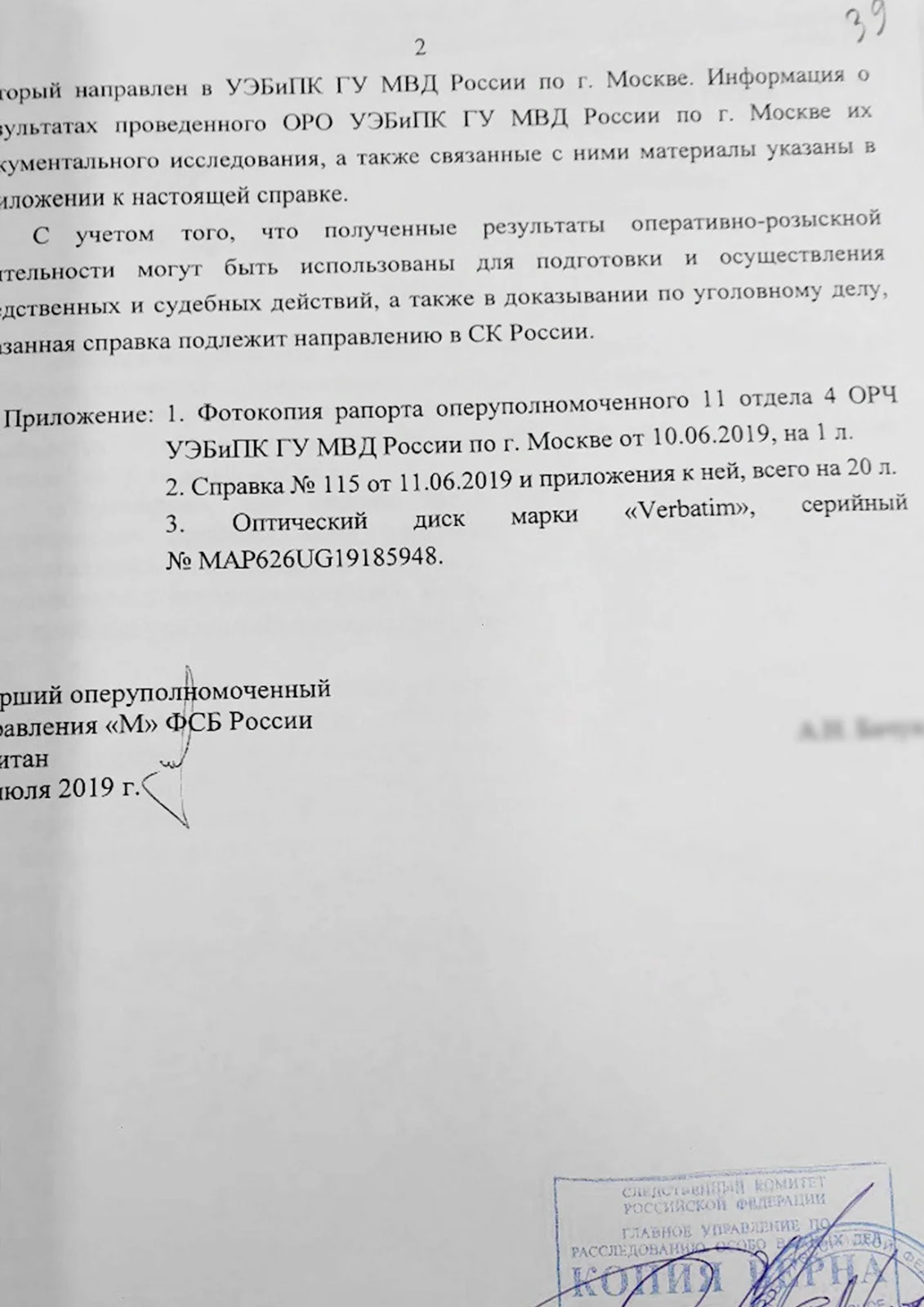 Эти цифры были также зафиксированы в «Постановлении о предоставлении результатов оперативно-разыскной деятельности органу дознания, следователю или в суд», подписанном 22 июля 2019 года генералом ФСБ, заместителем начальника Управления «М».