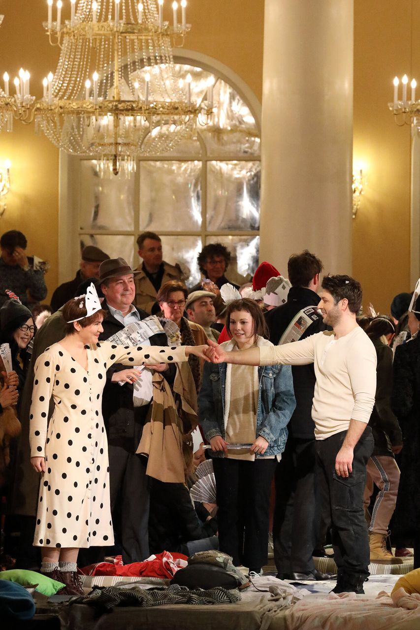 Если бы мы ставили драматический спектакль по роману Толстого, то такого рода вольности, конечно, очень сильно резали бы ухо и глаз. Но мы ведь ставим оперу Прокофьева, и мы приносим на сцену и в зрительный зал весь тот культурно-исторический багаж, который соединяет год 1812-й, когда произошло нашествие Наполеона, год 1856-й, когда Толстой начал писать свой роман, год 1941-й, когда Прокофьев начал писать свою оперу, год 1946-й, когда эта опера была поставлена и раскритикована, 1953 год, когда Прокофьев умер в один день со Сталиным, и наши не благословенные времена. Именно потому что мы делаем оперу, а не роман и мы покрываем таким образом огромное культурно-историческое пространство, намного большее, чем если бы мы просто делали экранизацию или драматизацию текста Толстого, — мы можем себе позволить такого рода вольности.