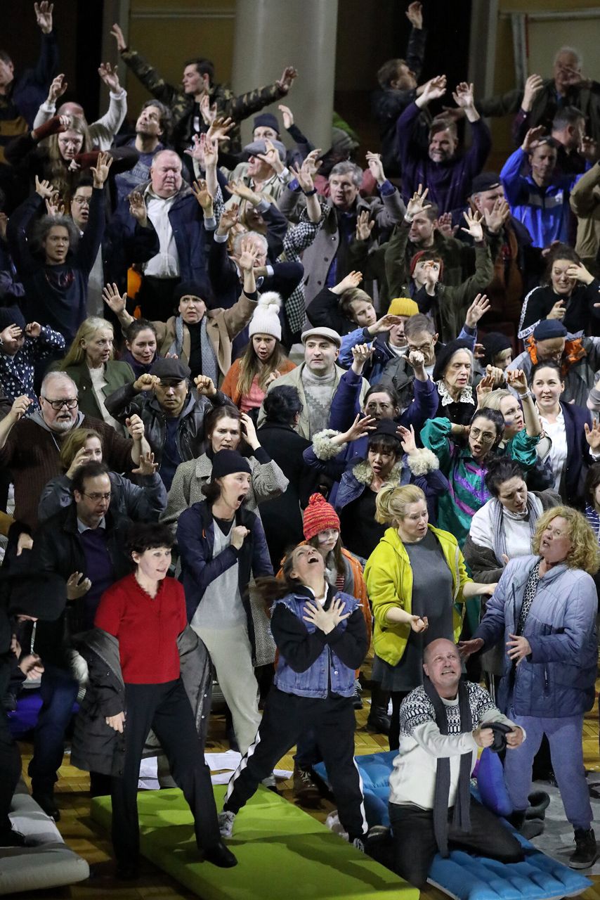 — Да, он совершил своего рода имплозию, то есть взрыв вовнутрь. У нас — некая выдуманная, дистопическая ситуация: русские заперты в Колонном зале Дома союзов посреди Москвы в обстановке, похожей на военную. Мы ни разу не объясняем, что, собственно, произошло. Это заданное условие игры: у нас отсутствует главная составляющая любой войны — внешний враг. У нас есть люди, чем-то напуганные, чем-то озабоченные и чем-то одержимые, а врага как такового нет. Поэтому они врага в итоге начинают искать и находить среди своих же. Хотя мы не меняли текст — и они продолжают говорить про французов, про немецких генералов, про русских шпионов и партизан.
