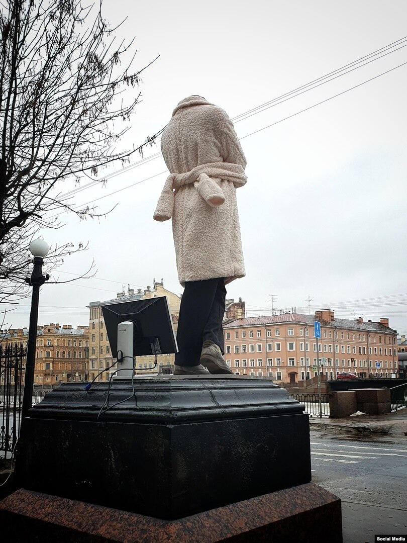 В комментариях обращают внимание на дополнительные смыслы: пальто похоже на смирительную рубашку, а у самого памятника нет головы.