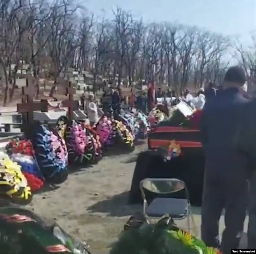Она также указывает, что вместе с гробами к кладбищу привезли грузовик щебня — вероятно, для отсыпки мест для захоронения. На записи также видно большое количество венков, гроб со столом для поминок и портрет мужчины в военной форме в черной раме, перед которым лежат гвоздики.