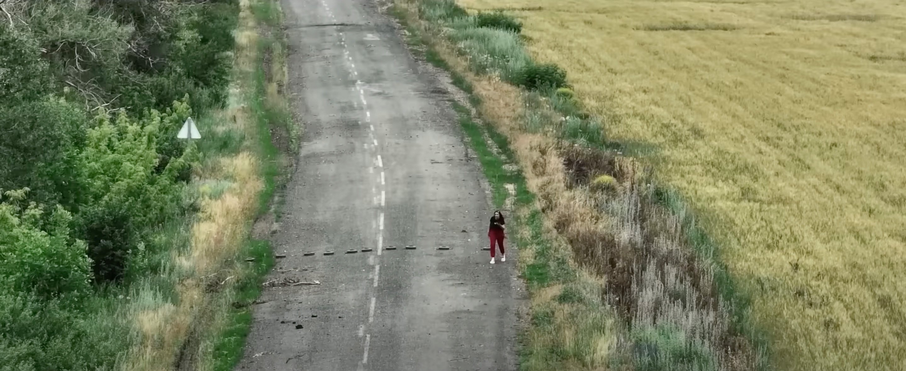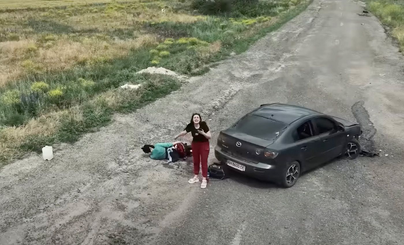 Валерия Пономарева и Андрей Богомаз на дороге. Кадр с камеры дрона ВСУ