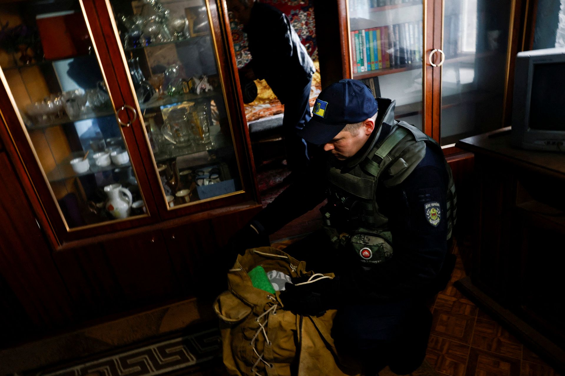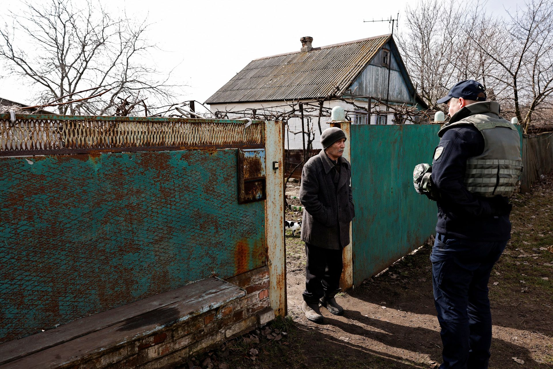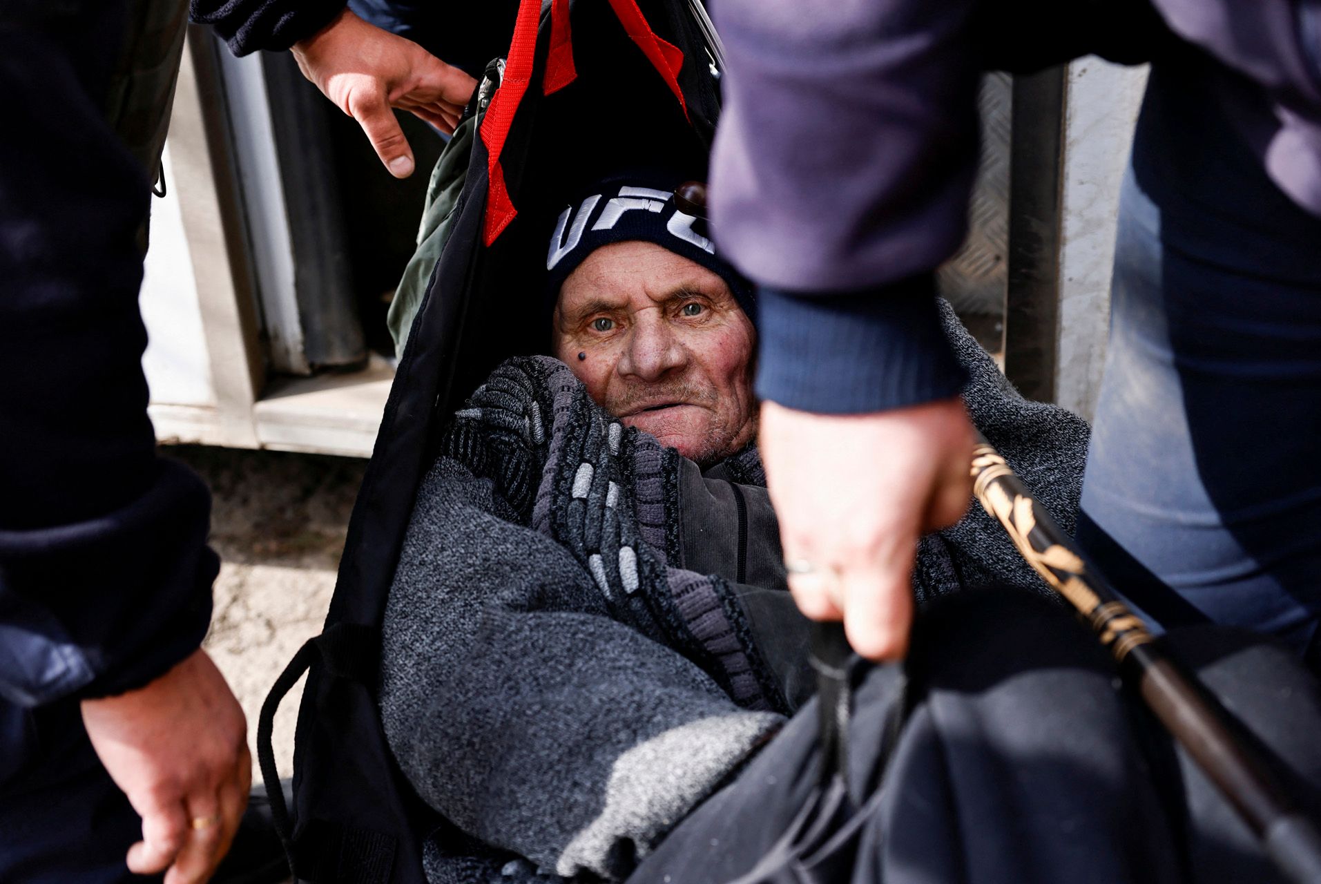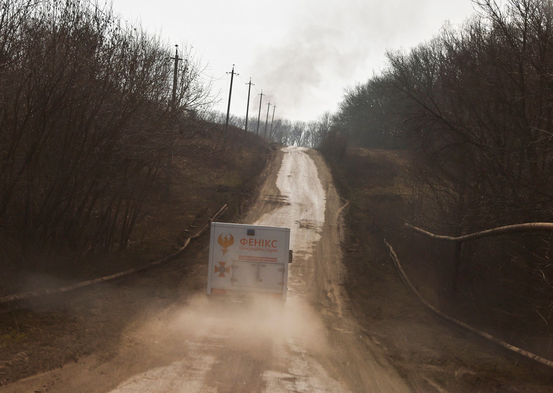 Violeta Santos Moura / Reuters / Scanpix / LETA Сотрудник Государственной службы Украины по чрезвычайным ситуациям (ГСЧС) Артур Спицын убеждает 74-летнего Василия Курлищука эвакуироваться из села Калиновка под Часовым ЯромVioleta Santos Moura / Reuters / Scanpix / LETA Артур Спицын помогает Василию Курлищуку собрать вещи перед эвакуациейVioleta Santos Moura / Reuters / Scanpix / LETA Сотрудники ГСЧС несут 74-летнего жителя Часова Яра Валерия Золотова к эвакуационному транспортуVioleta Santos Moura / Reuters / Scanpix / LETA Автомобиль ГСЧС выезжает из села Калиновка. На горизонте виден столб дыма от пожара