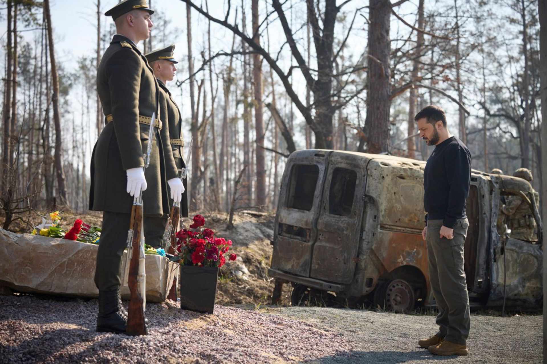 Пресс-служба президента Украины Президент Украины Владимир Зеленский перед мемориалом памяти бойцов ВСУ, погибших в боях за село Мощун Киевской области в начале марта 2022 года. По мнению Зеленского, это был «один из переломных моментов в истории современной Украины». Он подчеркнул, что более двух недель украинские военные сдерживали здесь вражеское наступление. Армия РФ, по подсчетам Би-би-си, потеряла здесь не менее 20 морских пехотинцев. По данным «Радио Свобода», в боях за село погибли как минимум около ста российских военных. Украинская сторона не публиковала официальных данных о своих погибших