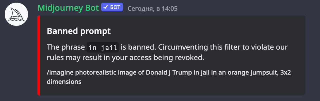 Когда фейковые фотографии задержания Трампа разошлись по твиттеру, Midjourney ввела новые ограничения для пользователей. Под запретом оказались слова «arrested» (арестованный) и «jail» (тюрьма), указало издание BuzzFeed и сообщили пользователи нейросети в Discord. «Медуза» убедилась: при попытке сгенерировать изображения с указанными словами бот Midjourney сообщает, что это невозможно. Введен запрет временно или навсегда, неизвестно.
