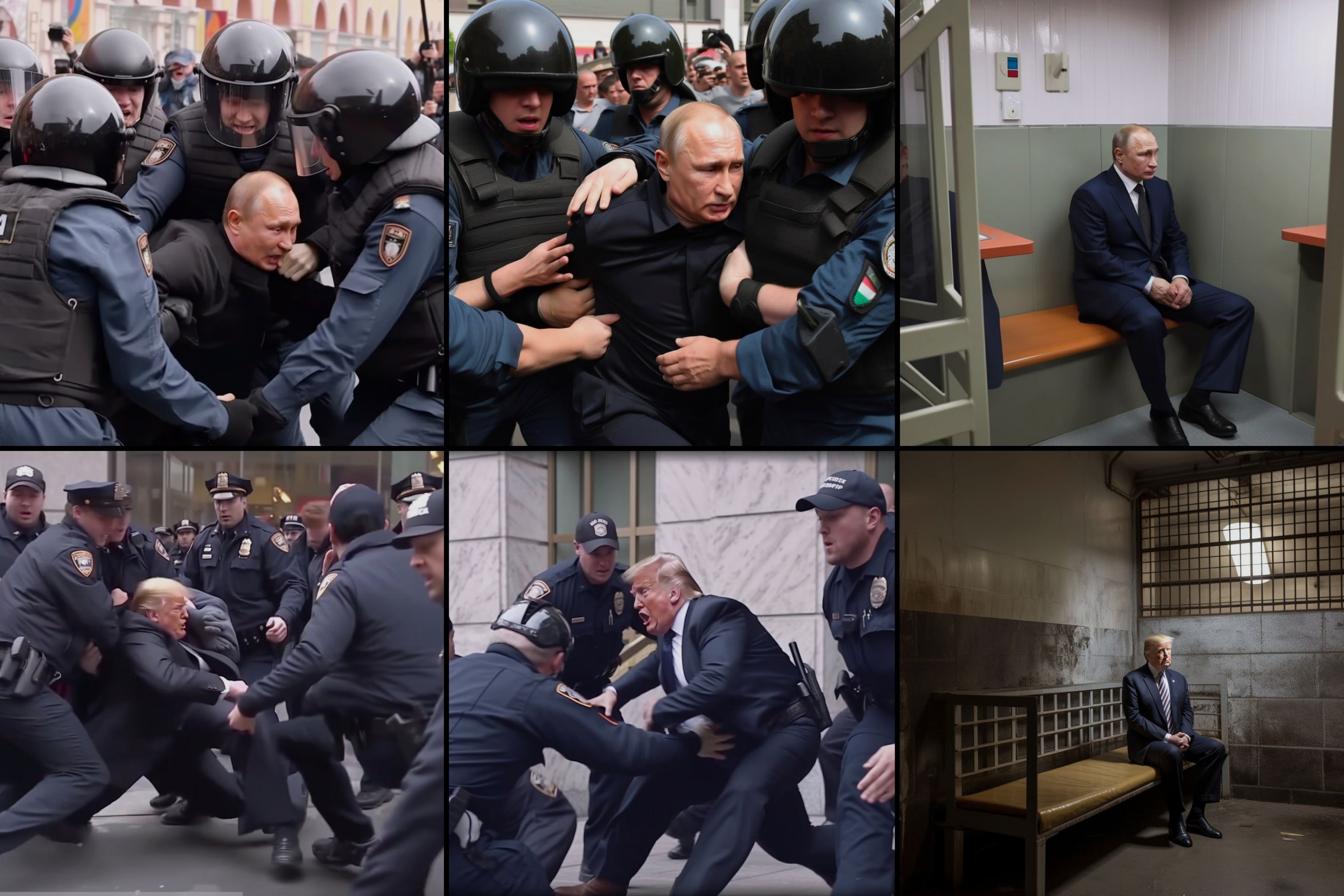 На изображениях, которые только в одном твиттер-аккаунте собрали 5,6 миллиона просмотров, Трамп публично сопротивляется задержанию и убегает от полицейских. То полицейские кладут его на землю, то против его воли несут на руках. В конфликте участвуют его сын и жена: Дональд Трамп — младший и Мелания Трамп. На следующих снимках бывший президент США одиноко сидит на койке в камере, затем плачет в суде, а потом (очевидно, после приговора) в оранжевом комбинезоне драит полы и чистит туалет тюрьмы. В какой-то момент он находит способ сбежать и добирается до «Макдоналдса».