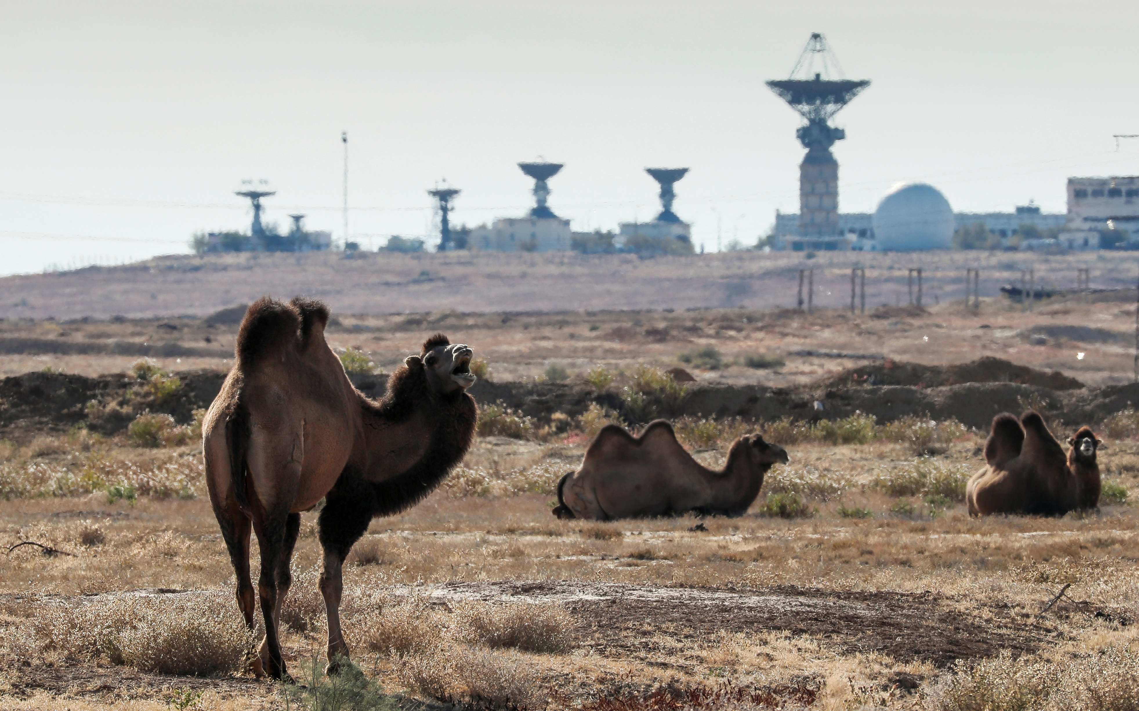 Верблюды на фоне станции слежения за космическими аппаратами на Байконуре
