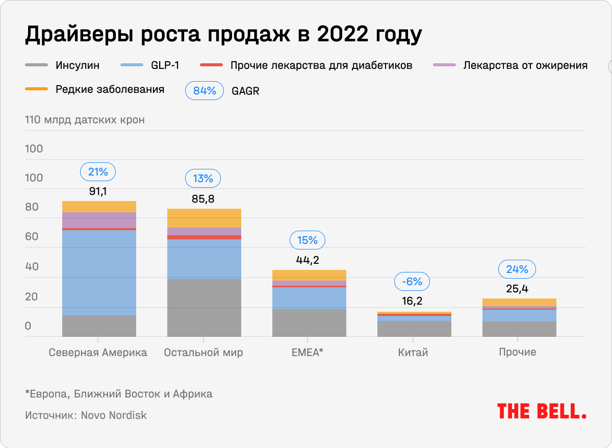 Сейчас ее препарат от ожирения Saxenda продается в 71 стране, а Wegovy получил одобрение в США (где он стал первым за семь лет подобным препаратом, одобренным FDA), Дании и Норвегии. Но большая часть продаж обоих лекарств приходится на Северную Америку. Это можно объяснить эффектом соцсетей и высокой распространенностью ожирения — в США им страдает более 40% населения.
