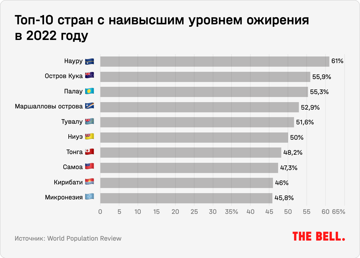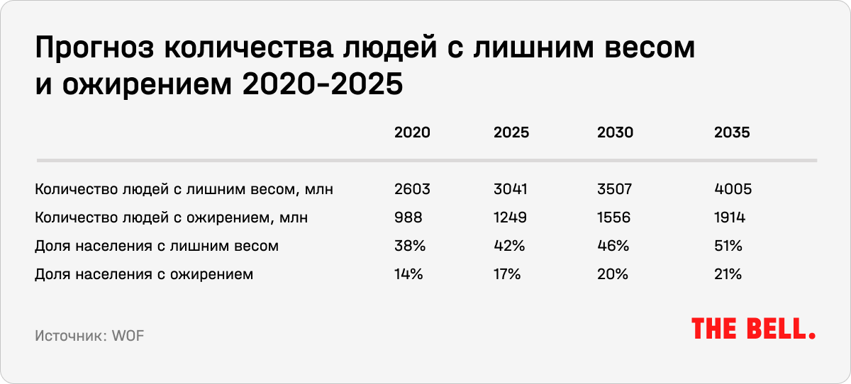 По данным Всемирной организации здравоохранения (ВОЗ), во всем мире более 2,6 млрд человек, то есть почти 33% населения Земли, живут с лишним весом, а ожирением страдают около 892 млн. К последней категории относятся люди с индексом массы тела (ИМТ) выше или равным 30, а избыточной массой тела считается ИМТ ≥ 25. Во Всемирной федерации по борьбе с ожирением (World Obesity Federation, или WOF) прогнозируют, что к 2035 году эти показатели существенно вырастут.