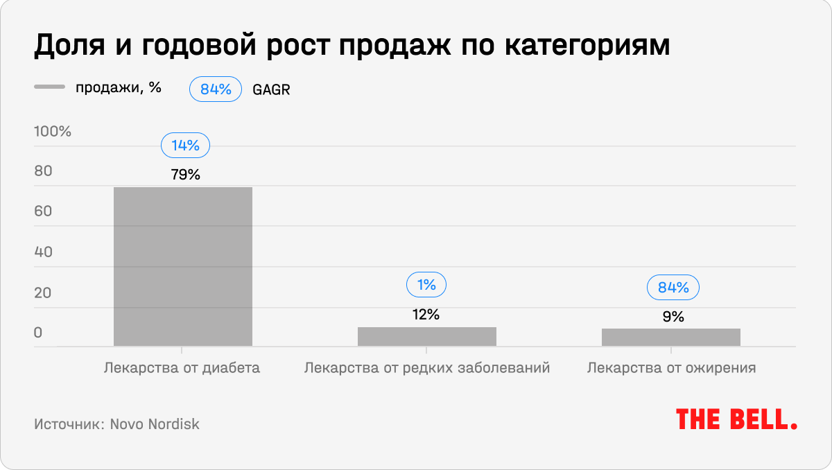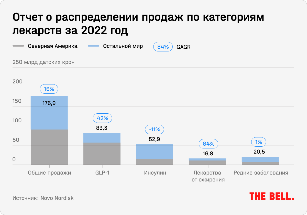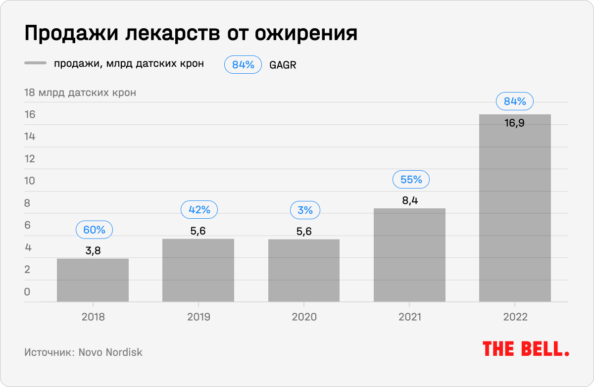 Компания первой выпустила на рынок инъекции от ожирения нового поколения и остается лидером этого быстрорастущего рынка с долей в 94%. Продажи средств от ожирения растут с 2018 года, а в 2022 году выручка этого сегмента выросла на 84%, до 16,9 млрд датских крон ($2,3 млрд). Это 9% от общего объема продаж компании. К 2025 году компания планирует увеличить этот показатель до $3,5 млрд.