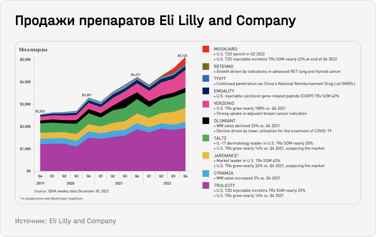 Mounjaro — это инъекционный препарат, который регулирует уровень сахара в крови и снижает массу тела. Менеджмент компании считает его одним из наиболее перспективных в своем портфеле. Аналитики швейцарского UBS оценивают потенциал годовых продаж препарата в $25 млрд, а Bank of America — в $48 млрд. Для сравнения, общая выручка Eli Lilly по итогам 2022 года составила $28,5 млрд. Таким образом, препарат может обеспечить почти двукратный рост доходов компании.