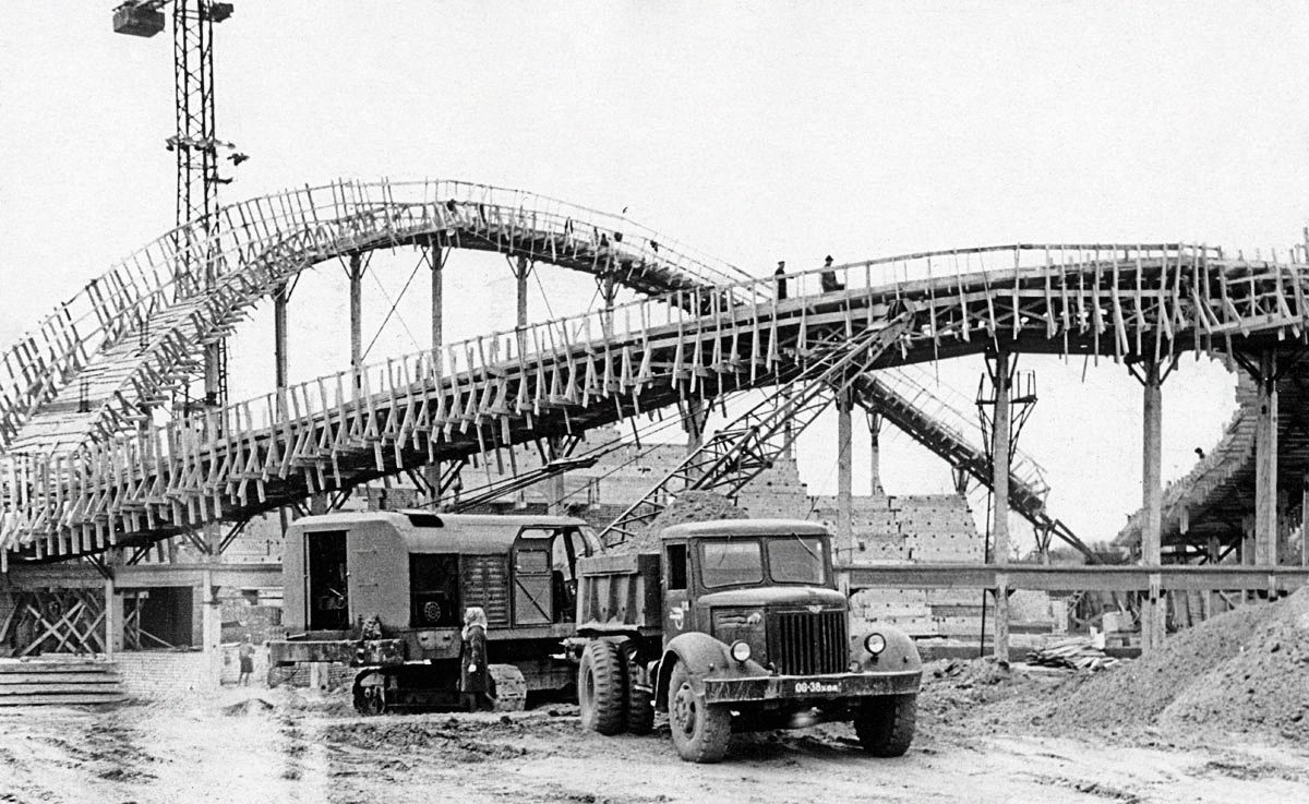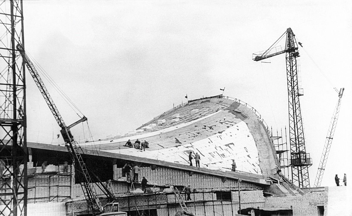 В архитектурных справочниках такую кровлю называют седловидной, а конструкцию, на которой она держится, — гипар, или гиперболический параболоид. Часто гипары состоят из двух железобетонных арок, которые установлены под наклоном. Арки соединены растянутыми между ними вантами (металлическими тросами). Последние хорошо видно на фотографиях, сделанных во время строительства «Юбилейного». Сверху на ванты уложена кровля, а под ними крепится подвесной потолок.