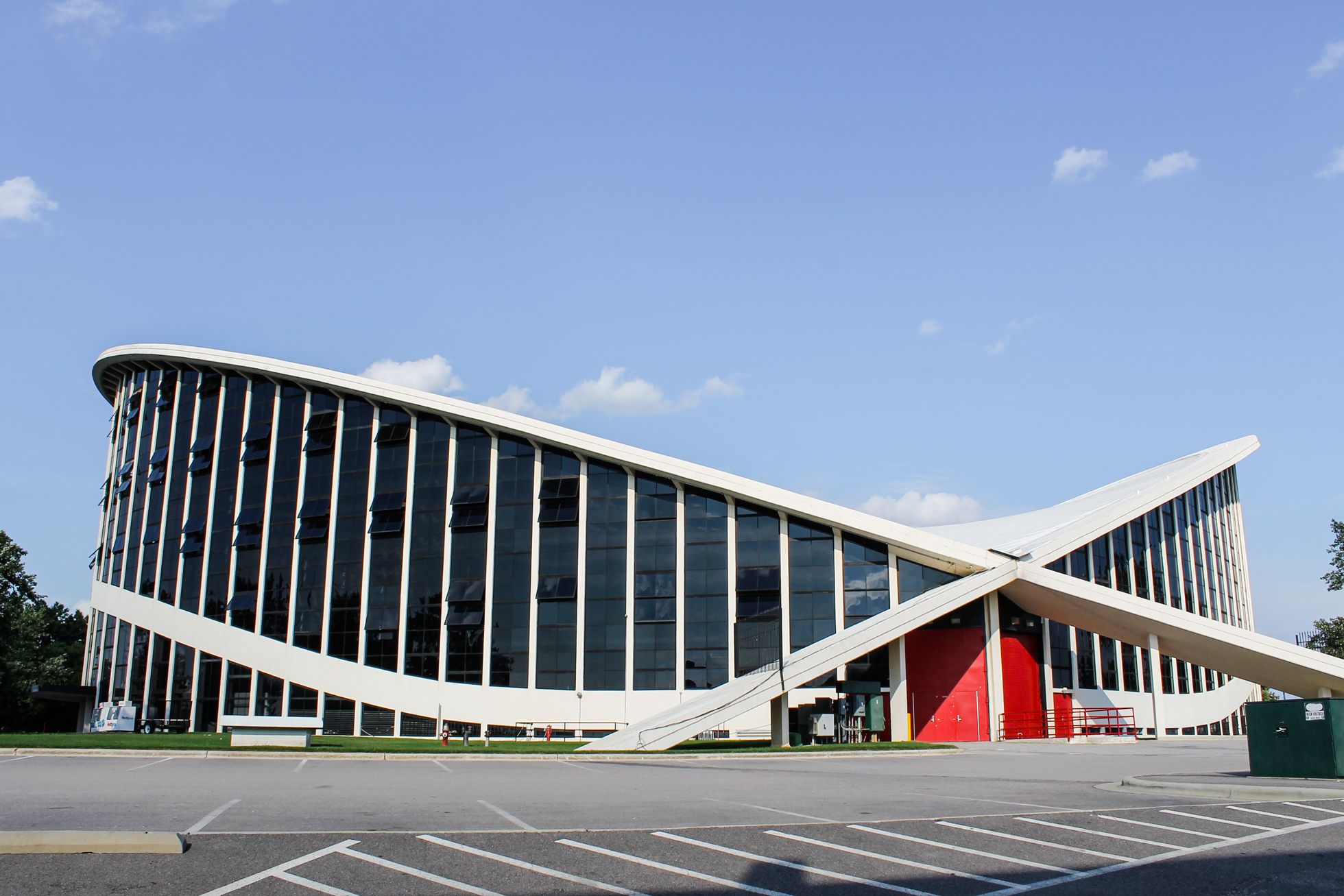 В зданиях с кровлей-гипаром ни стены, ни фасад не принимают на себя основную несущую нагрузку — поэтому облицовку можно сделать из легких и недорогих материалов. Последнее, по всей видимости, и стало решающим в харьковском проекте, который должен был быть недорогим.