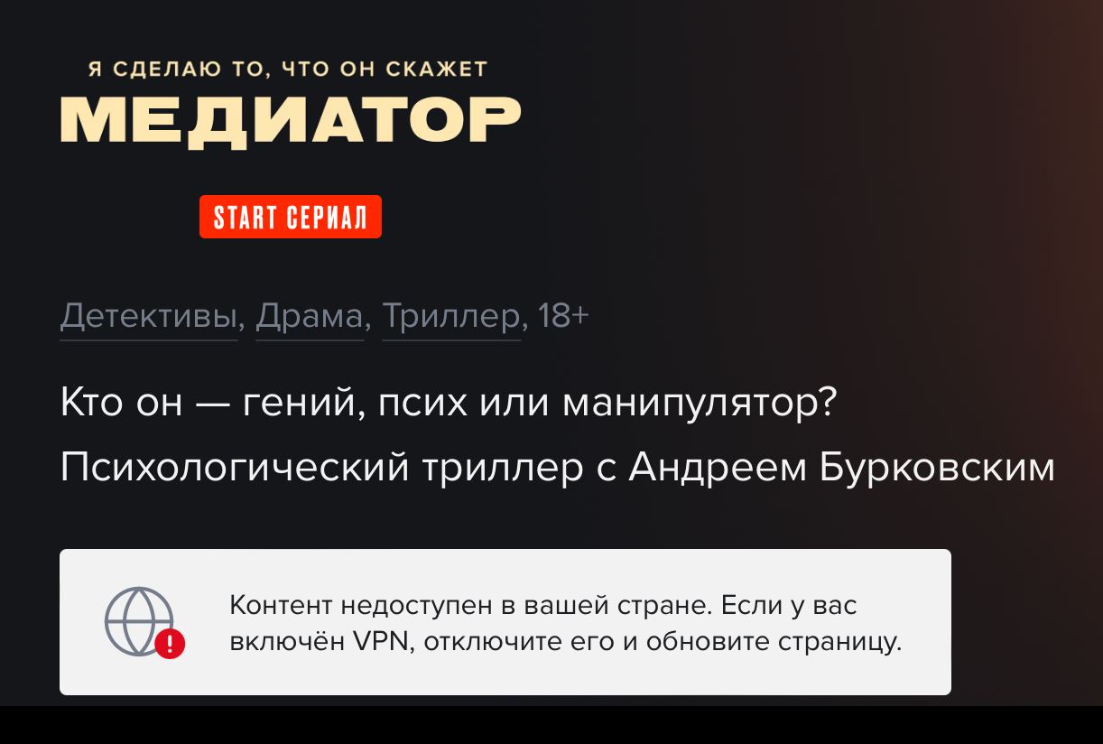 Детали. «Кинопоиск» и IVI полностью закрыли доступ к просмотру сериала. Start, являющийся правообладателем «Медиатора», при попытке просмотра из России сообщает зрителю, что в этой стране сериал недоступен и предлагает отключить VPN, если пользователь его использует. При заходе на сайт онлайн-кинотеатра из-за рубежа сериал становится доступен к просмотру. Первым на исчезновение сериала обратил внимание телеграм-канал «продюсер от бг».