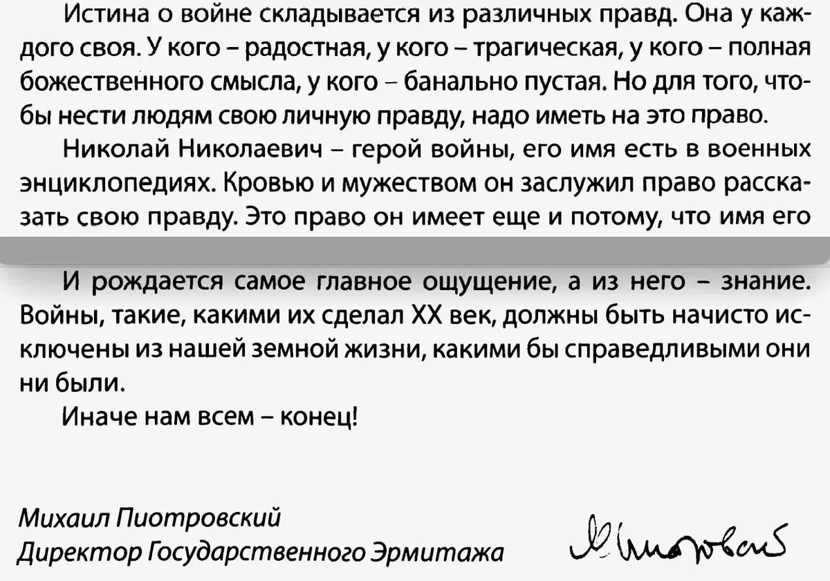 В 1975-м, через 30 лет после войны, решился написать воспоминания. Еще через 32 года, в 2007-м, они были изданы. Публикуем фрагмент. Внимательно прочтите последний абзац. Предисловие к этим мемуарам написал академик Пиотровский. Его последний абзац (на фото) тоже внимательно прочтите.