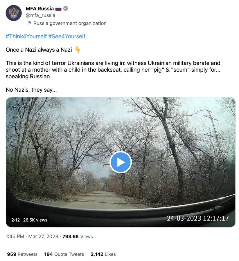 Официальный аккаунт российского Министерства иностранных дел удалил видео, на котором якобы украинские военные оскорбляют женщину за русскую речь, обратил внимание в своем твиттере основатель Bellingcat Эллиот Хиггинс. Это видео оказалось российским фейком, выяснили OSINT-аналитики.