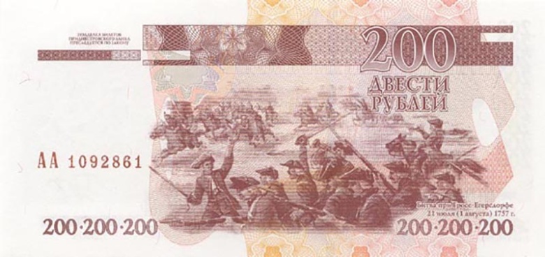 Грос-Егерсдорфское сражение на приднестровской купюре в 200 рублей. В битве у деревни Гросс-Егерсдорф (Восточная Пруссия) 19 (30) августа 1757 года 55 тыс. русских солдат под командованием фельдмаршала Степана Апраксина одержали верх над 28-тысячной прусской армией фельдмаршала Иоганна фон Левальда. Несмотря на победу, после битвы Апраксин приказал отступить.