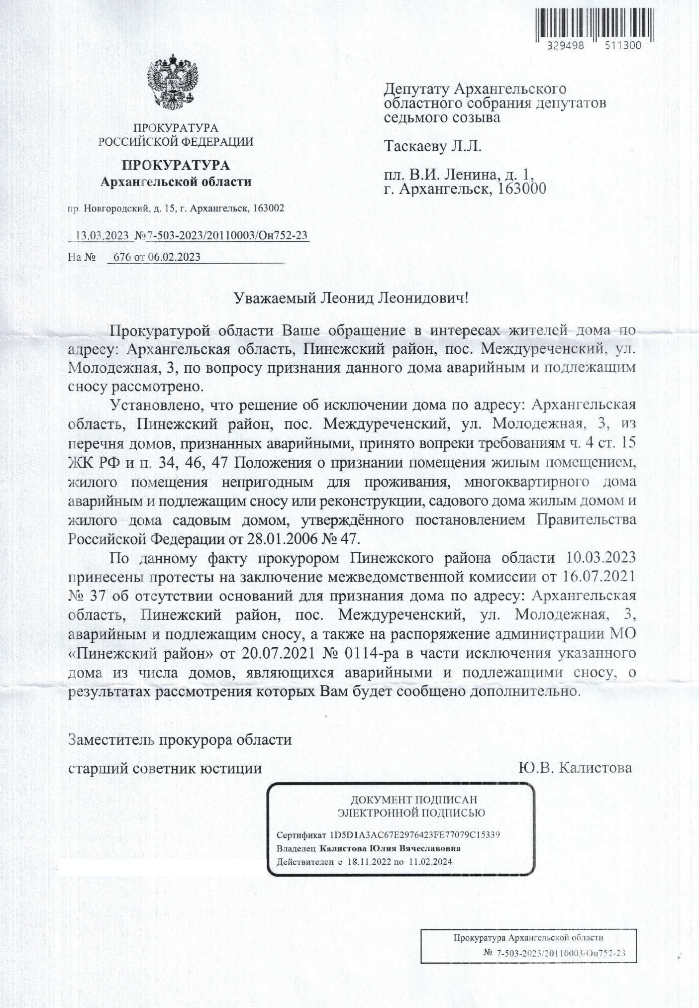 После проверки, проведенной по депутатскому запросу, решение об исключении дома на Молодежной из перечня аварийных и подлежащих сносу опротестовано прокурором. В свете пинежских событий, хочется посоветовать северянам, проживающим в домах, которые ранее были признаны аварийными и подлежащими сносу не только в Пинежском районе, удостовериться в том, что их дома таким же образом, «под шумок», не были исключены из очереди на расселение, а то отдельные чиновники, как оказалось, давно додумались до того, что количество аварийных домов можно сократить, никого из них не расселяя... И судя по тому, что никаких «страйков» главам, создающим условия для нарушения прав огромного количества северян, от губернатора не «прилетает», похоже, это очередной «вскрывшийся» тренд.