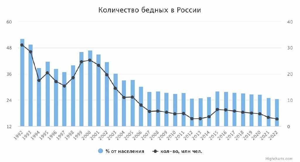 «В России зафиксирован минимальный уровень бедности с начала 1990-х. В 2022 году за чертой бедности в России находились 15,3 млн россиян, или 10,5% населения, сообщил Росстат. Это на 0,7 млн человек, или 0,5 процентного пункта (п.п.) ниже результата предыдущего года и рекордно малый показатель в истории Российской Федерации (у Росстата есть ряды с 1992 года)».