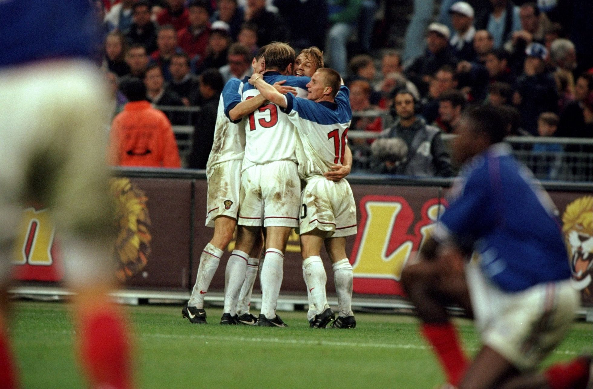 Stu Forster / Allsport / Getty Images 5 июня 1999 года: Россия празднует победный гол Валерия Карпина в отборочном матче чемпионата Европы против Франции на стадионе «Стад де Франс» в Сен-Дени
