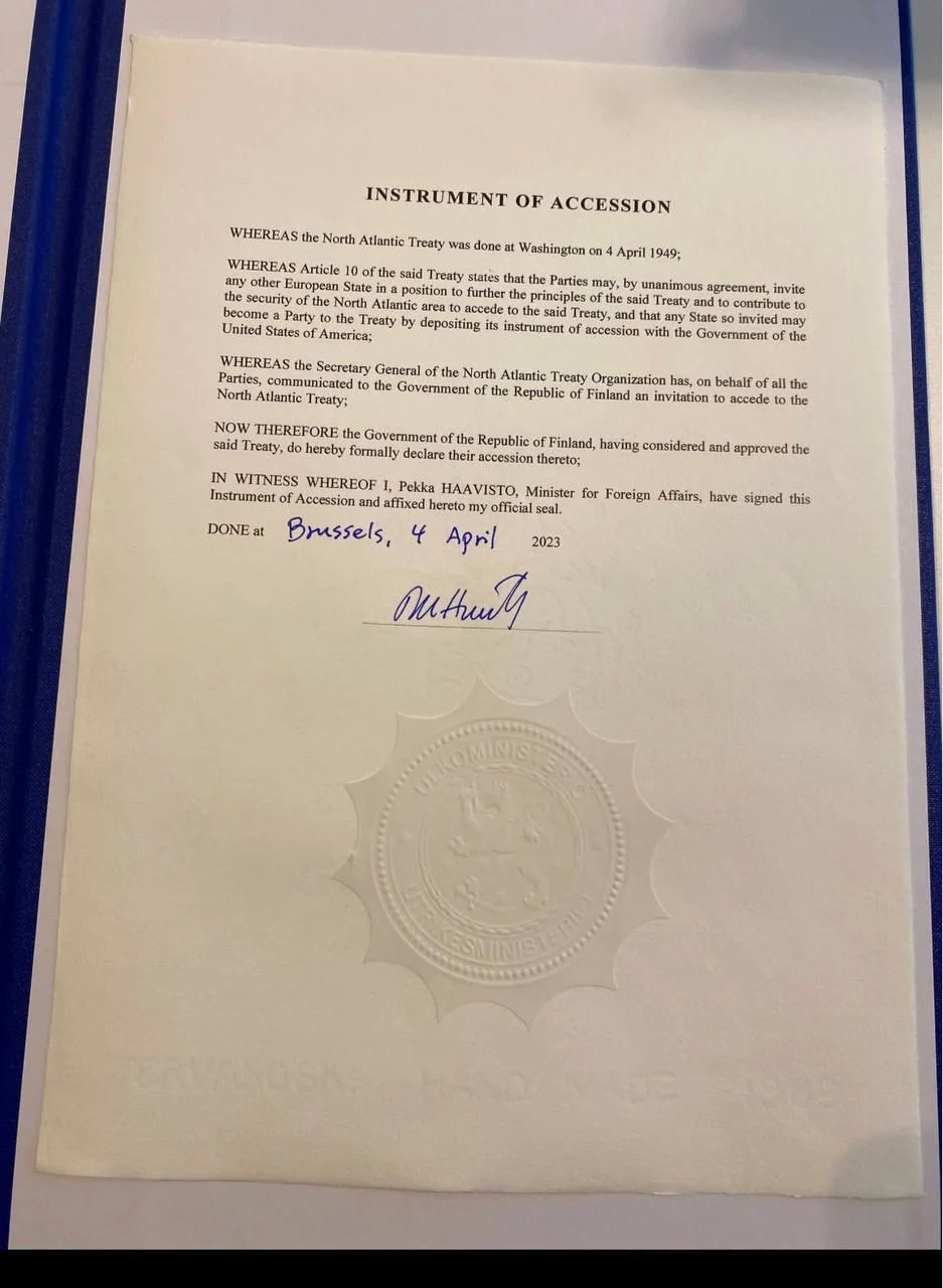Pekka Haavisto, the Foreign Minister of Finland, has signed the document that joins his country to NATO, Yle reports.
