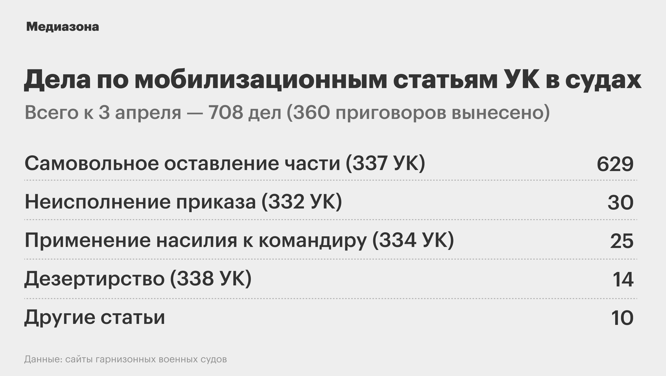 По статье о неисполнении приказа (332 УК) в суды поступило 30 дел, по статье насилии в отношении командира (334 УК) — 25 дел. Еще 14 дел рассматриваются по статье о дезертирстве (338 УК) и десять — по другим статьям, ужесточенным после мобилизации: о сопротивлении начальнику (333 УК), уклонении от службы (339 УК), нарушении уставных правил (344 УК), уничтожении или повреждении военного имущества (346 УК) и утрате военного имущества (348 УК).