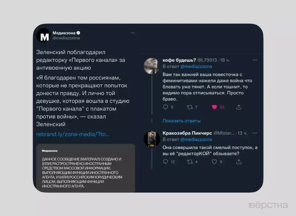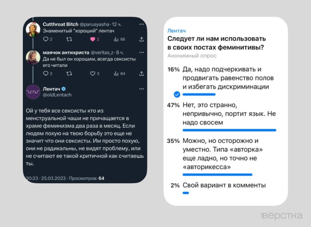 Недавно популярный миллионный паблик Лентач аж два раза провёл опросы, нужно ли им использовать феминитивы или оставить только «секретаршу» (которая никого не обижает и не задевает). И это очень показательно. Я отметила в реплаях, что этот паблик всегда отличался сексистской оптикой — на что мне дали такой ответ: