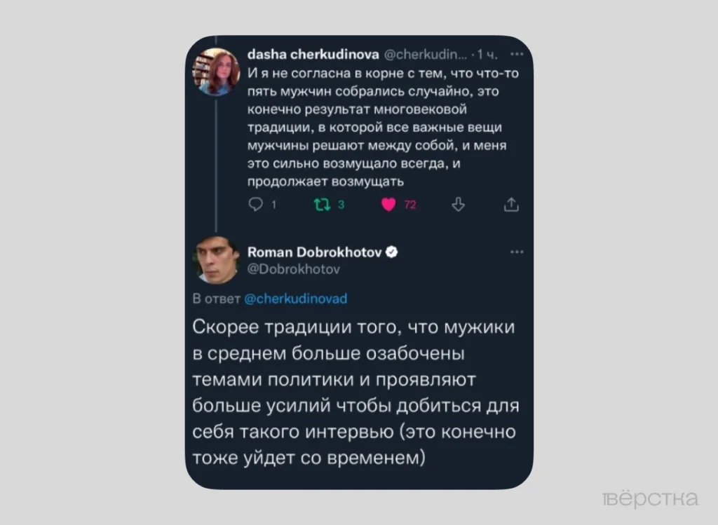Невидимая мизогиния проявляется везде — в том числе там, где её не замечают даже самые прогрессивные менеджеры. Вспомним того же Зеленского — в прошлом году знаменитое интервью у президента Украины брали пять мужчин. И ни одной женщины-журналистки.