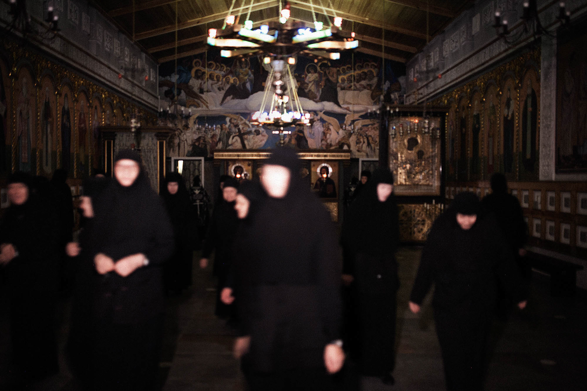 Ночную литургию В Иверском женском монастыре открывает с чтения «Часослова» на верхнем клиросе (балконе) сестра Елизавета, которую постригли в монахини в 2017 году. Ей тогда было 29 лет.