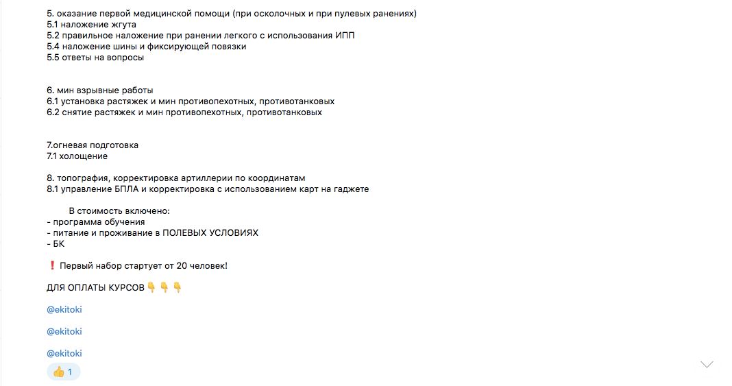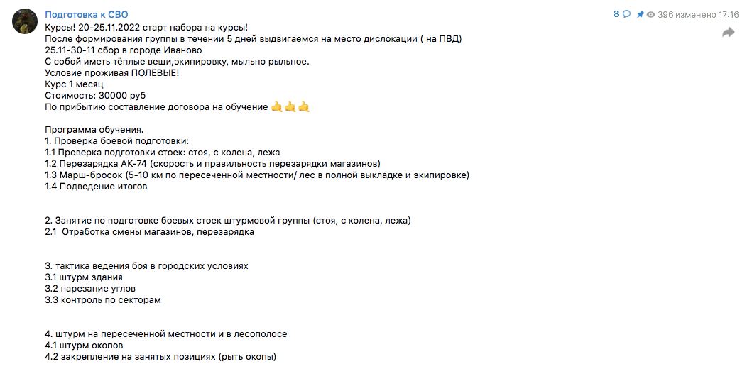 В конце ноября в канале появилось объявление о наборе на платные курсы, стоимостью 30 тысяч рублей за месяц обучения. Желающихобещалиобучить тактике ведения боя в городских условиях, оказанию первой медицинской помощи, огневой подготовке, установке растяжек и мин, управлению дронами и другим навыкам.
