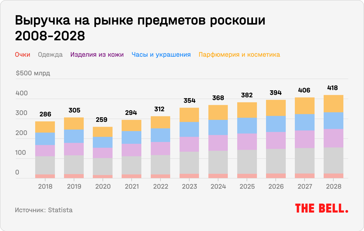 Рынок люкса не полностью независим от ситуации в экономике: пандемийный 2020 год ударил и по нему. Однако после снятия ограничений индустрия начала стремительно восстанавливаться, а по итогам 2022 года превысила допандемийный уровень. По оценкам Statista, за последний год рынок предметов личной роскоши увеличился на 6,3% и достиг $312 млрд.