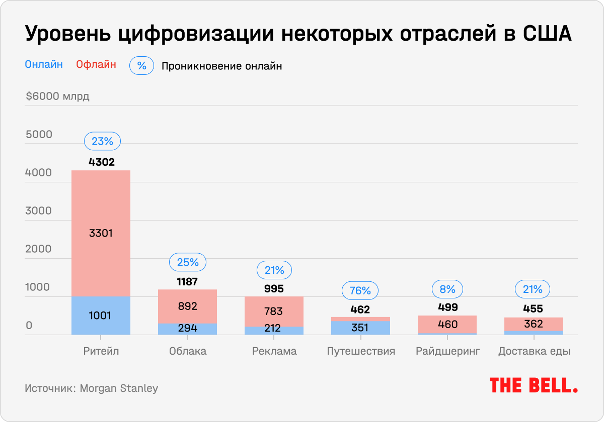 Инновации, связанные с ИИ, изменят сценарии поведения потребителей и приведут к тому, что около $200 млрд из $5,9 трлн, которые сейчас тратятся офлайн ежегодно, перейдут в онлайн к 2025 году, говорится в недавнем отчете Morgan Stanley (есть у The Bell). Список этих инноваций включает: