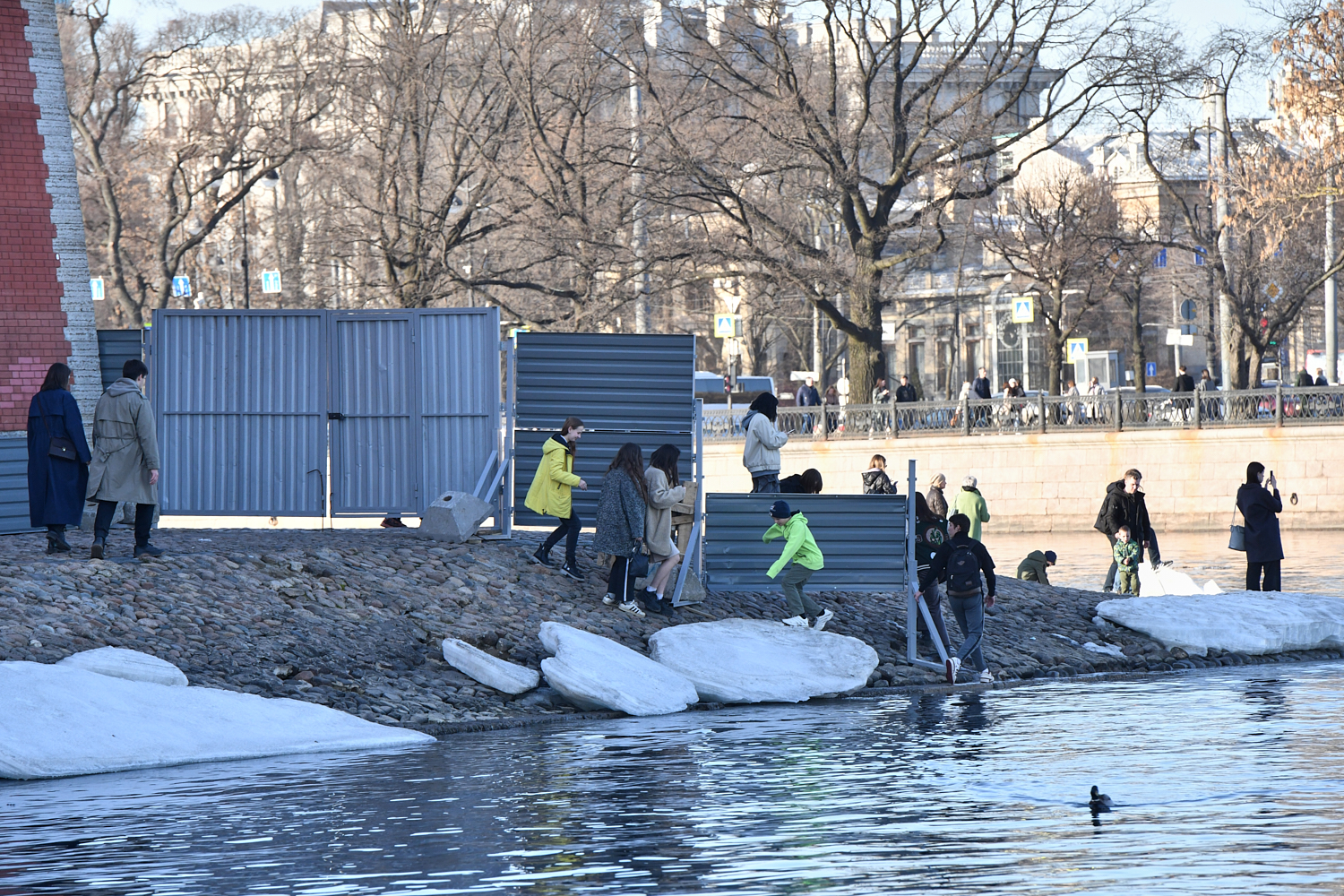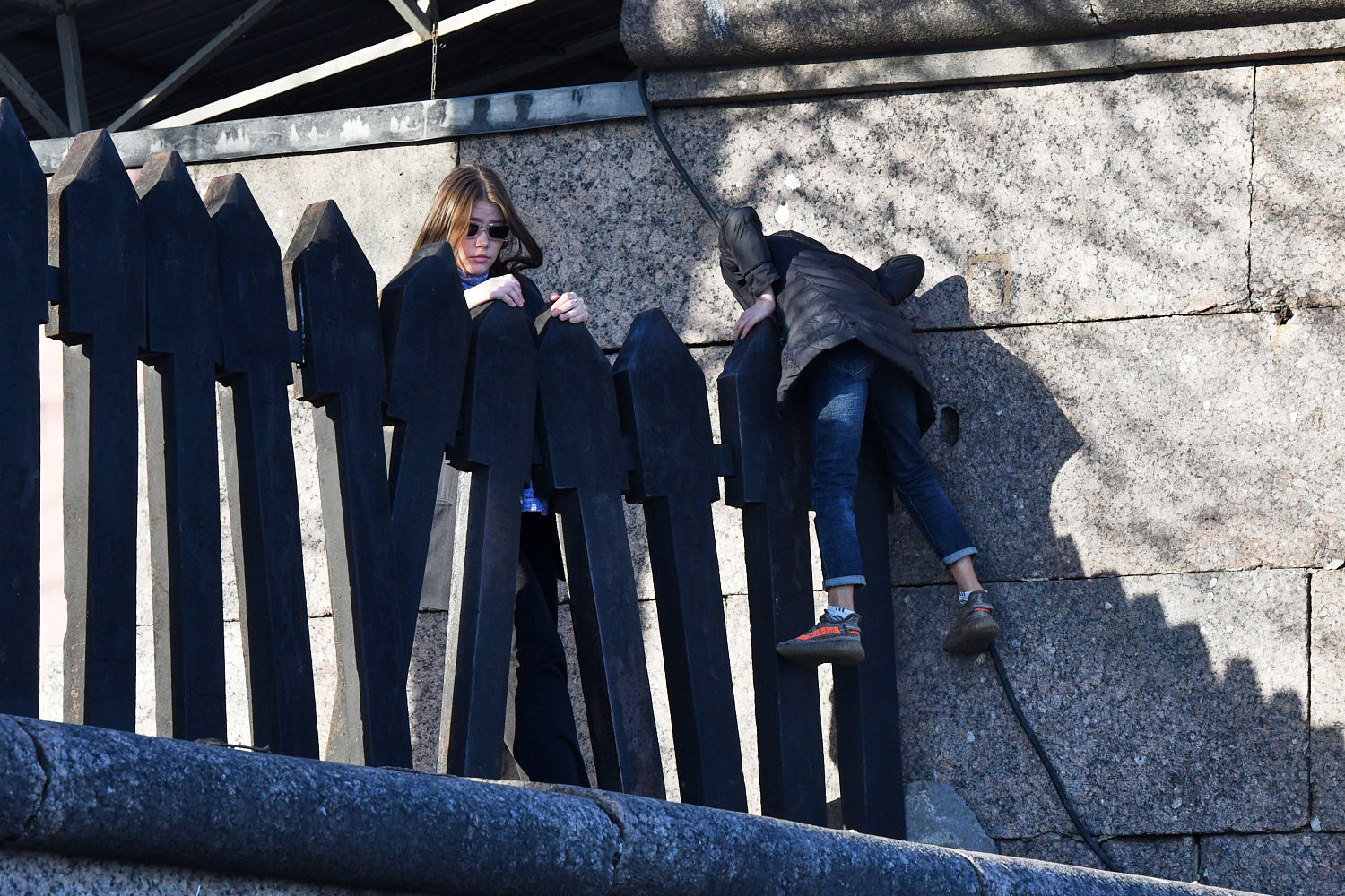 Петербуржцы перелезают через забор, который установили у Петропавловской крепости в конце марта. Из-за реставрации гранитного фасада Петропавловки на острове уже закрыли проход вдоль Невы, который идет от Иоанновского равелина до Трубецкого бастиона.