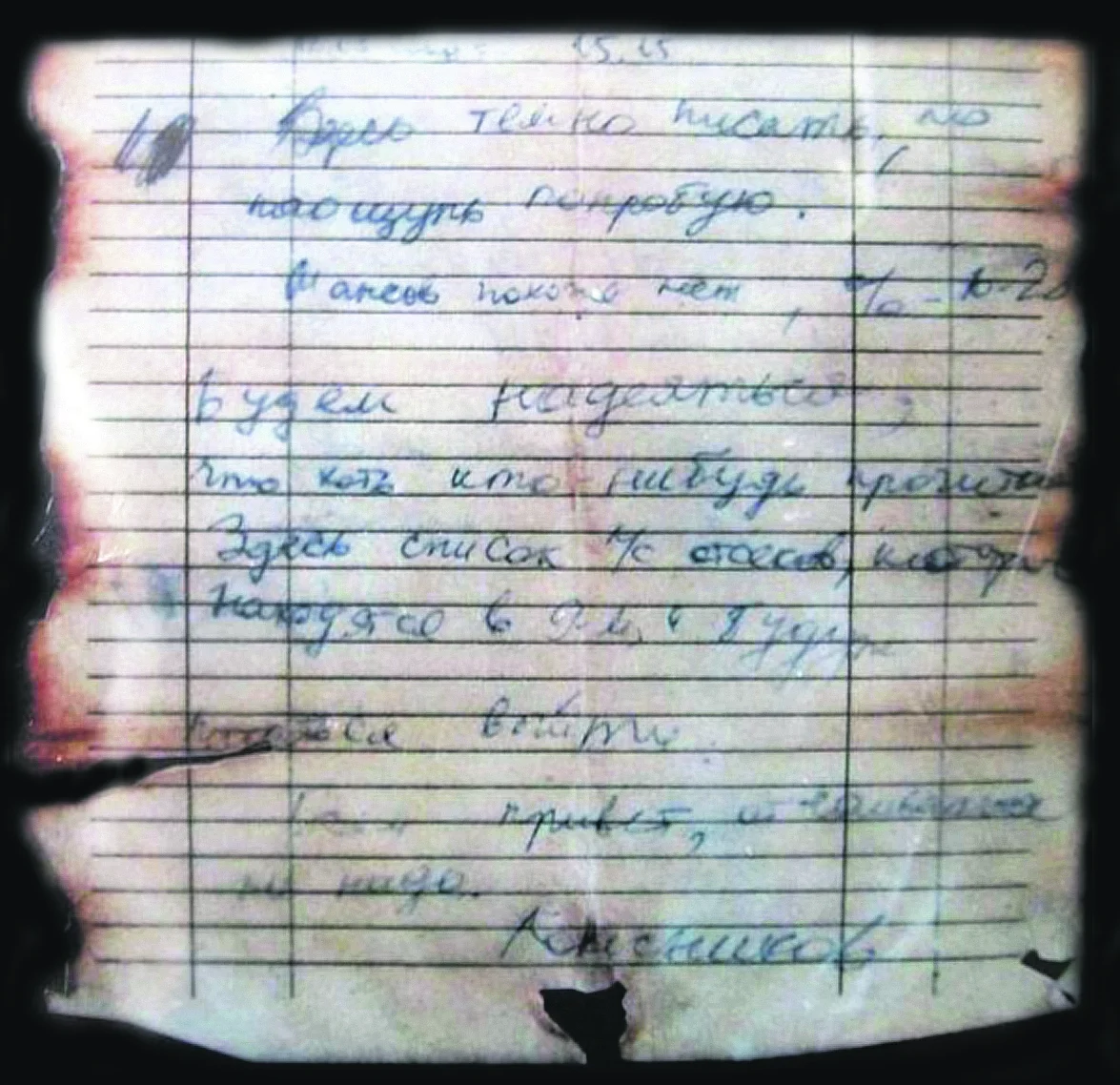И наконец, самая известная часть этих записей, сделанная капитан-лейтенантом Андреем Колесниковым. Она не обозначена никаким временным промежутком. Почерк меняется. Строчки размашистые и «пляшут» по всей странице, буквы — то очень большие, то совсем маленькие. «Здесь темно писать, но на ощупь попробую. Шансов, похоже, нет: процентов 10–20. Будем надеяться, что хоть кто-нибудь прочитает. Здесь список личного состава отсеков, которые находятся в 9-м и будут пытаться выйти. Всем привет, отчаиваться не надо. Колесников».