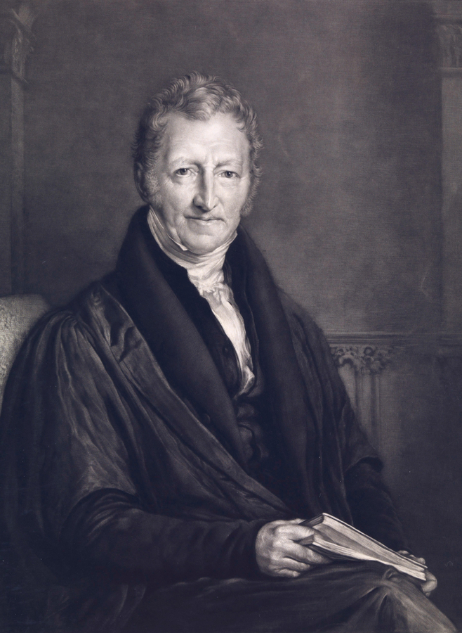 Томас Роберт Мальтус (1766–1834) — английский экономист и демограф. Мальтус родился в семье потомков королевских аптекарей, получил степень магистра в Колледже Иисуса в Кембридже и остался в нем преподавать. Спустя восемь лет после получения степени, в 1798 году, он публикует свой самый известный труд «Эссе о принципе народонаселения» («An Essay on the Principle of Population»), в котором отвечает на излишний оптимизм идей эпохи Просвещения о развитии общества. Эту работу он будет дополнять в течение всей жизни, уточняя аргументацию и включая ответы на критику. Последнее, шестое полное издание «Эссе» вышло в 1826 году.