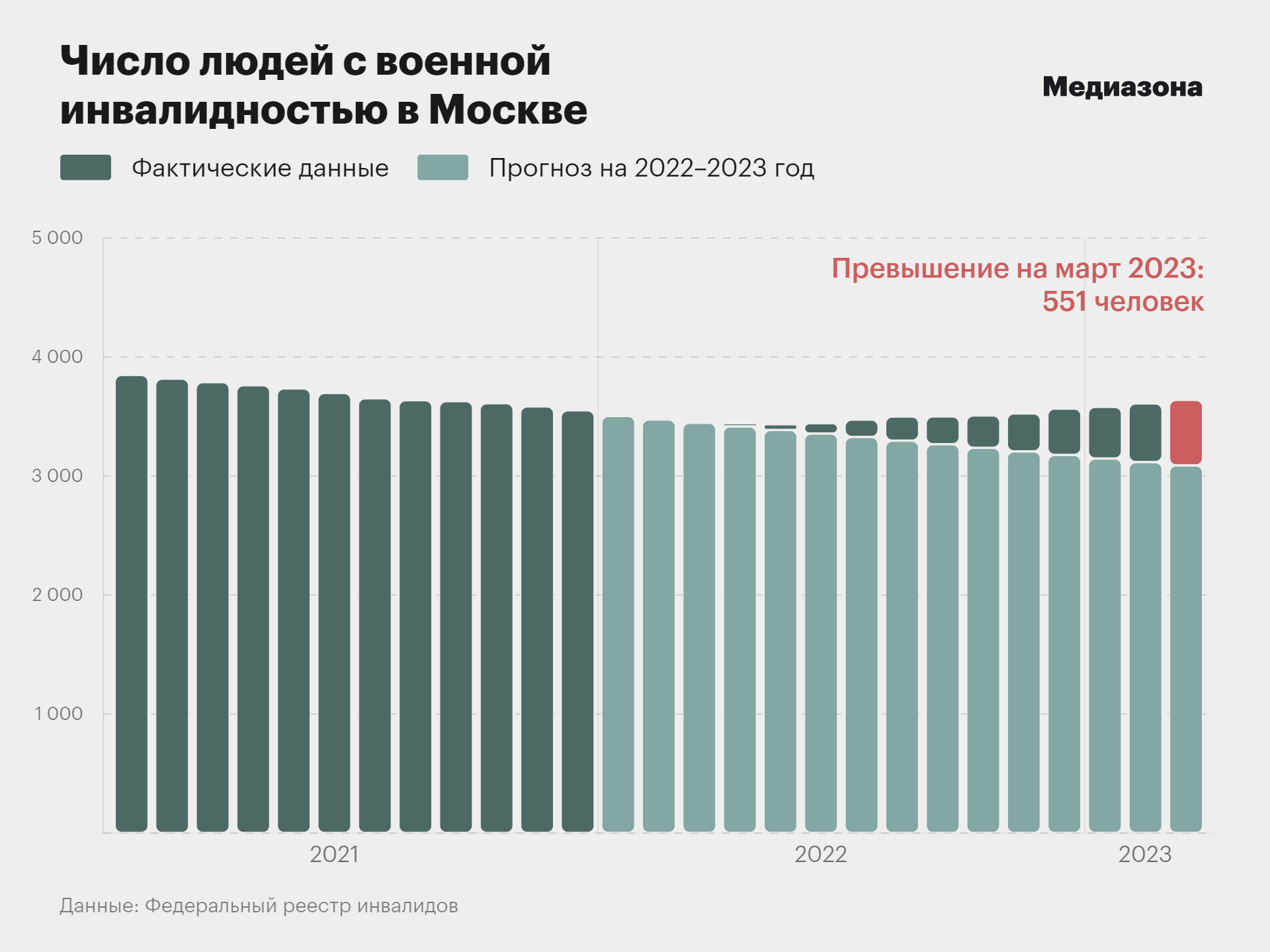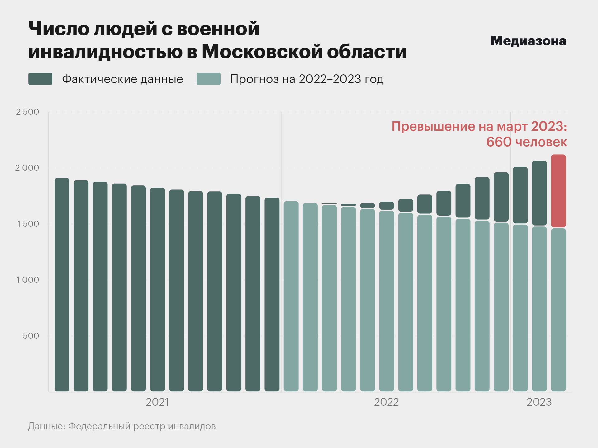 До начала войны с Украиной число людей, живущих с военной инвалидностью, сокращалось на несколько тысяч каждый год. Покалеченные предыдущими войнами ветераны умирали, а новых до 2022 года почти не появлялось: в категорию военных инвалидов попадают лишь те, кто получил увечье «при защите Родины, на фронте, военной службе на территории других государств».